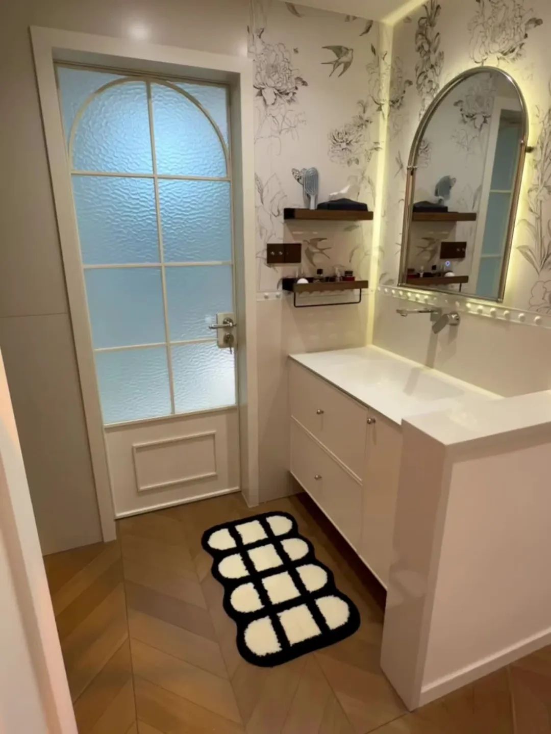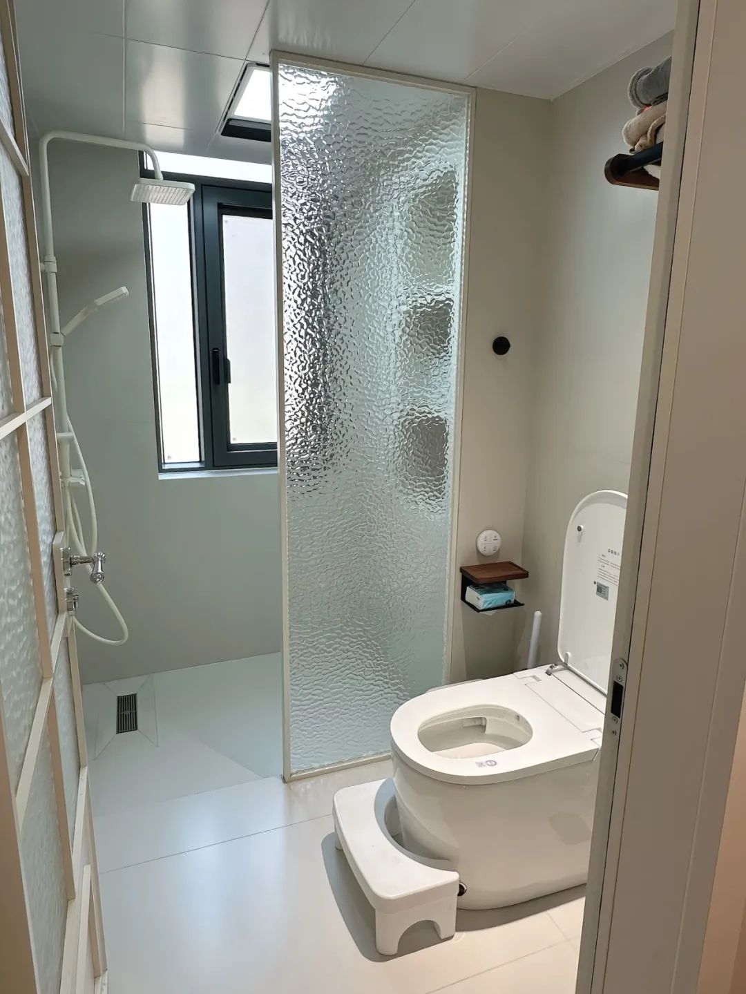 卫生间半墙设计,空间更加通透,三区分离,磨砂玻璃隔断,更加方便,没做镜柜,胡桃木色置物架收纳上墙.