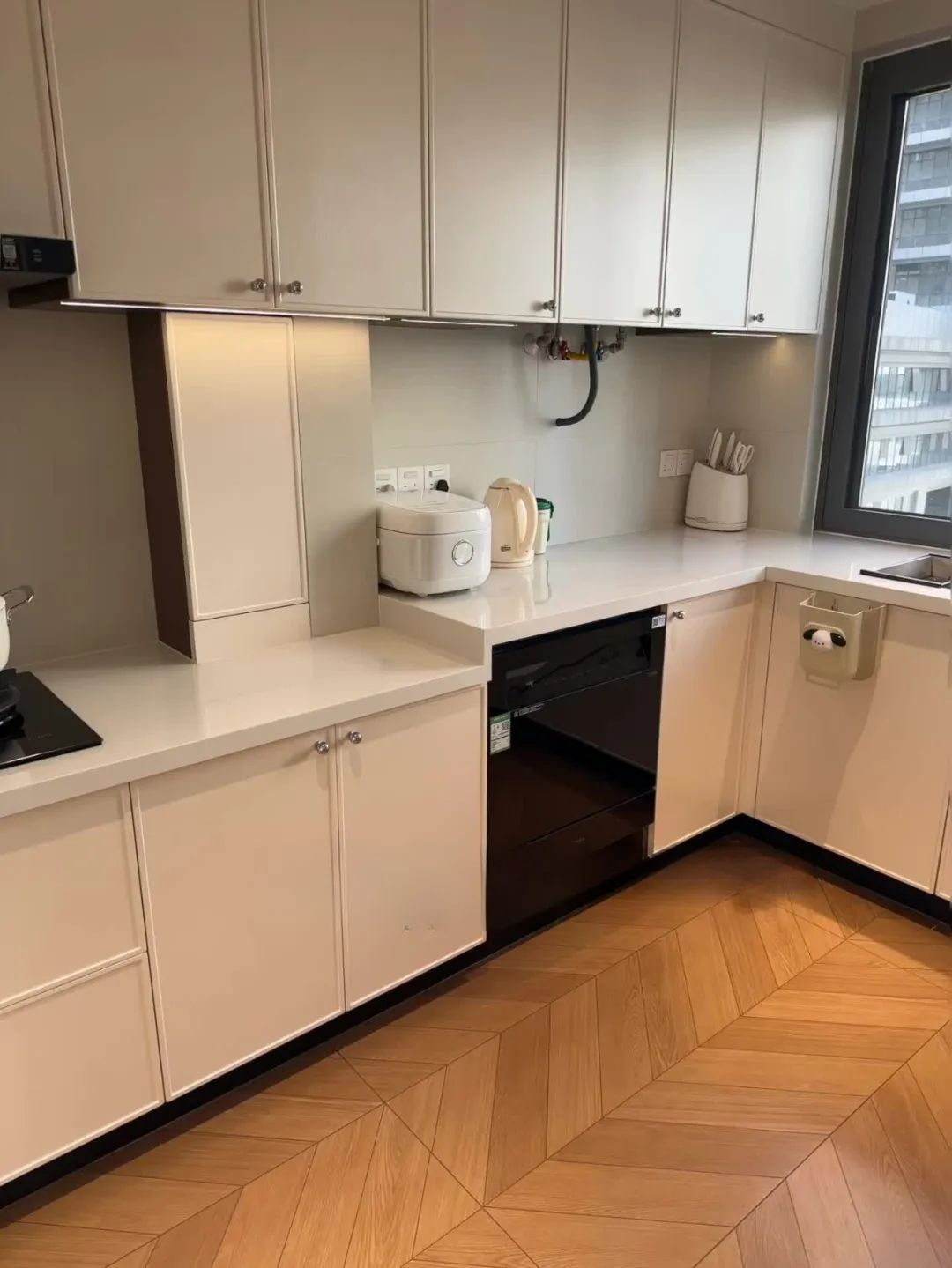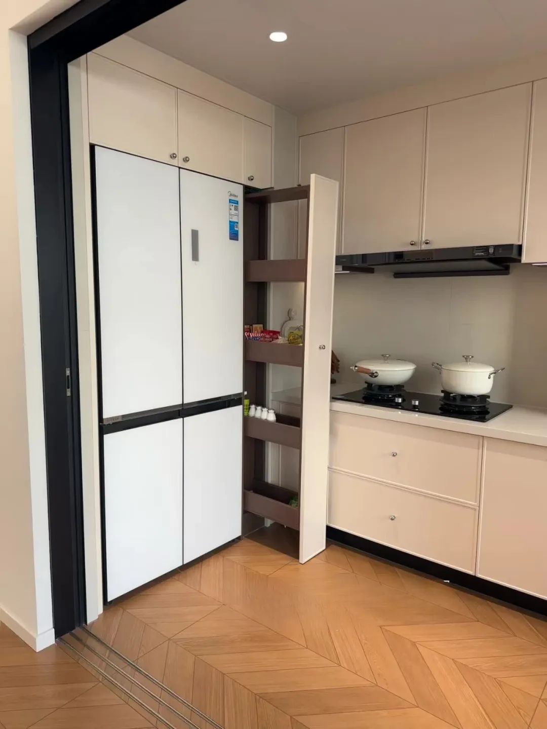 厨房做的嵌入式冰箱,冰箱旁边的空间做成抽拉式的零食柜,空间可以很好的被利用;