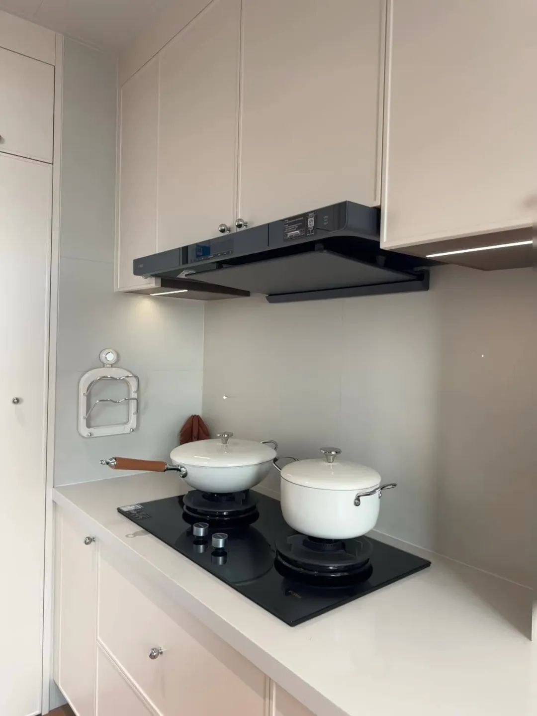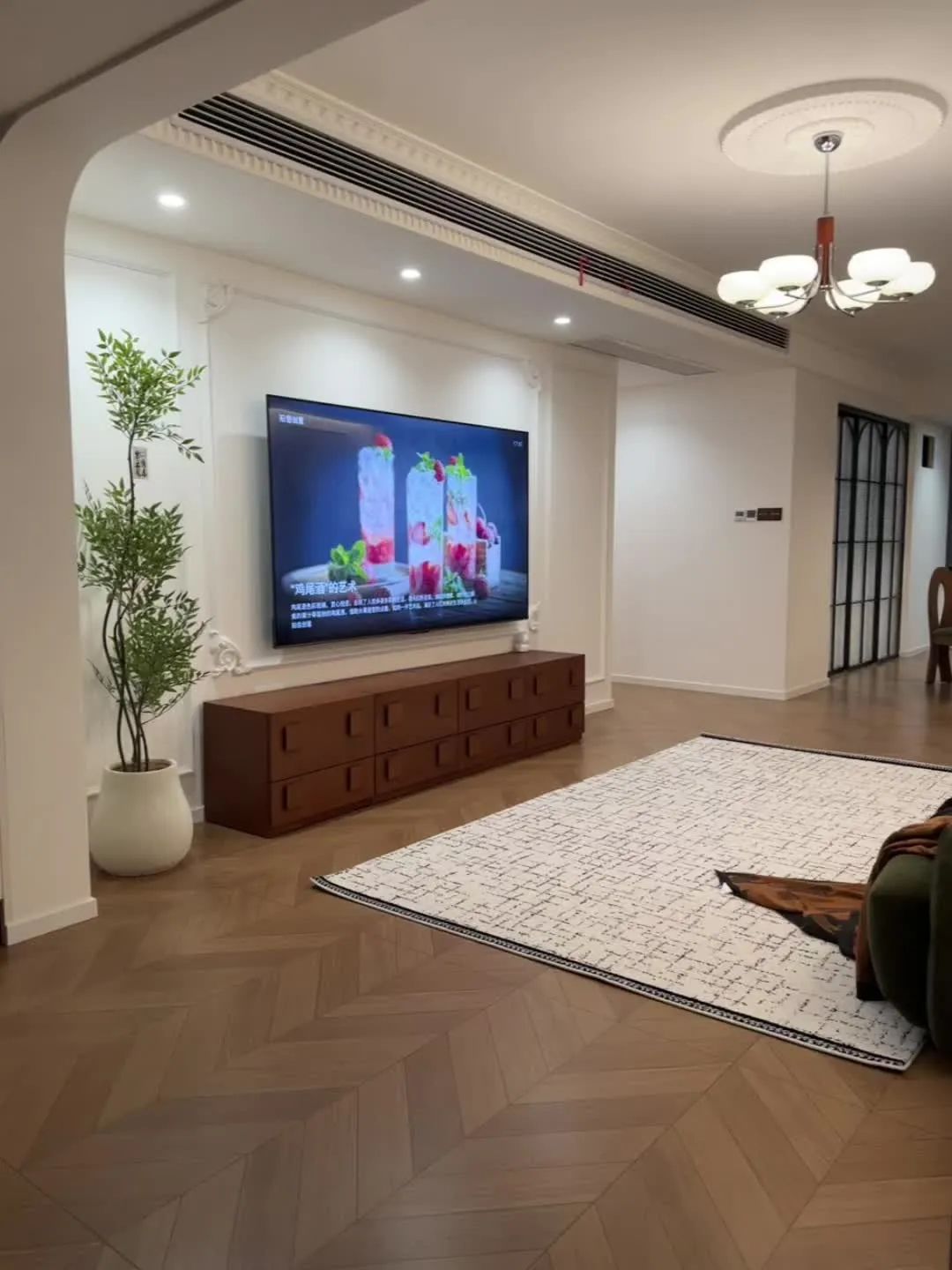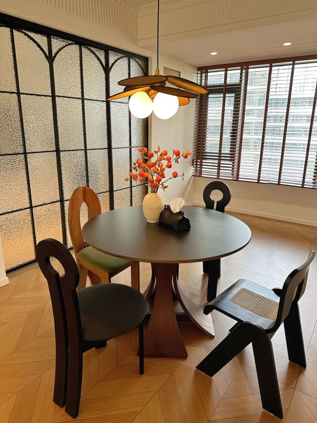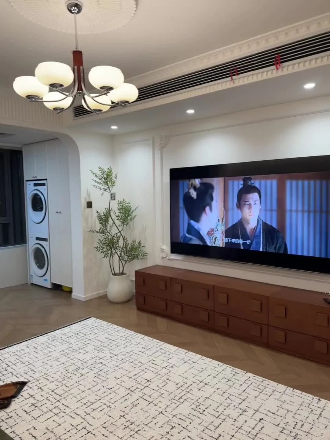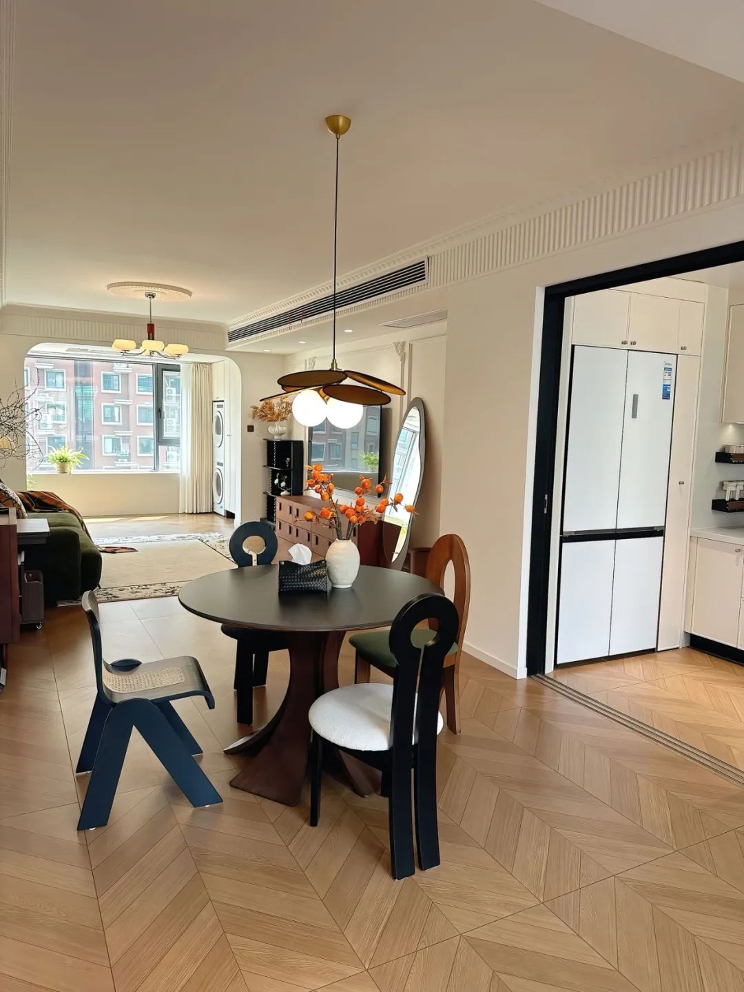 餐厅开间2.7米,餐桌直径1.1米 ,全屋定制一排餐边柜,小户型用圆桌真的很有氛围感