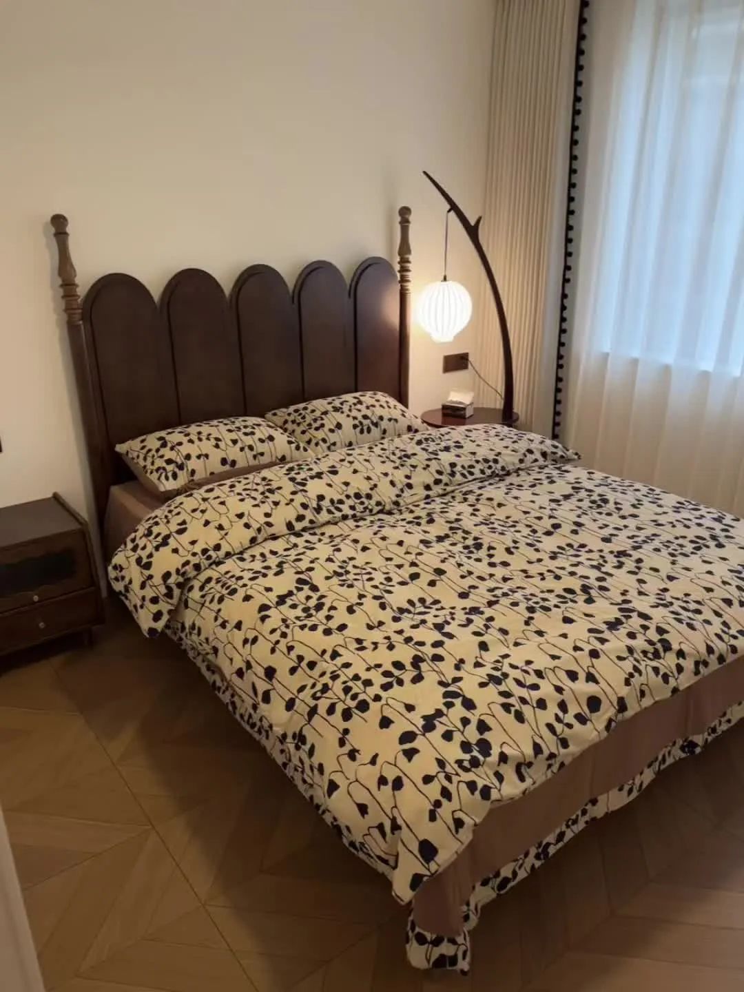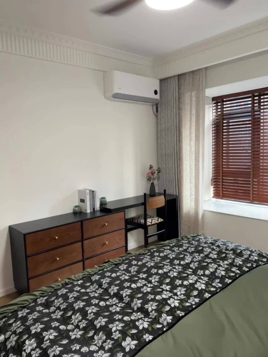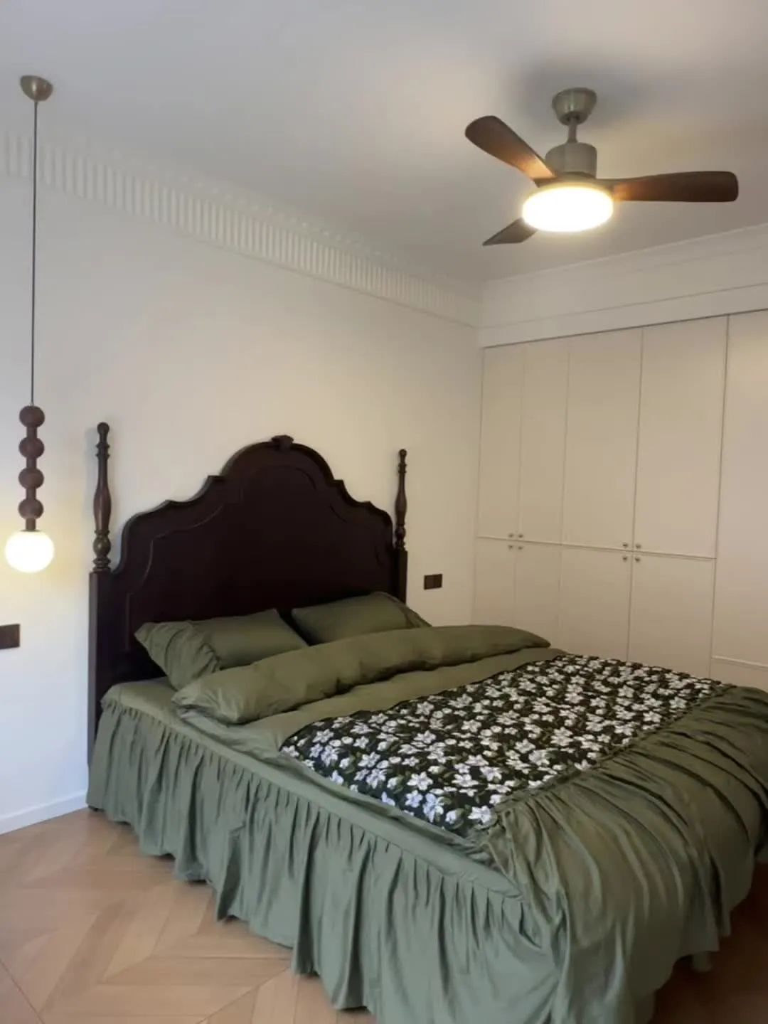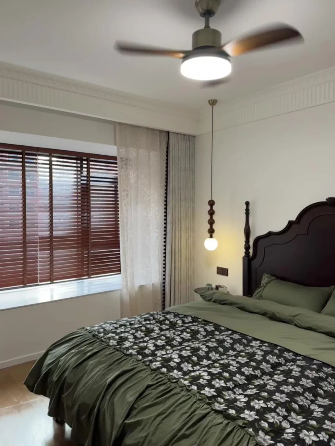 主卧没做中央空调选择挂机,安装了风扇灯,美观又实用,用落地灯代替传统床头柜;