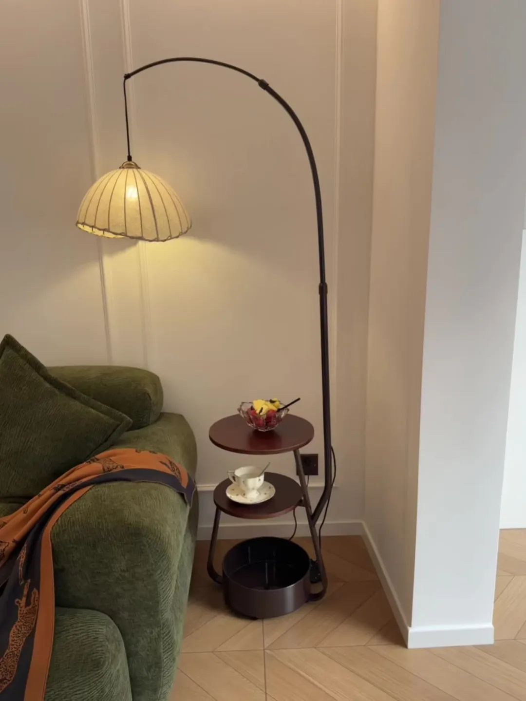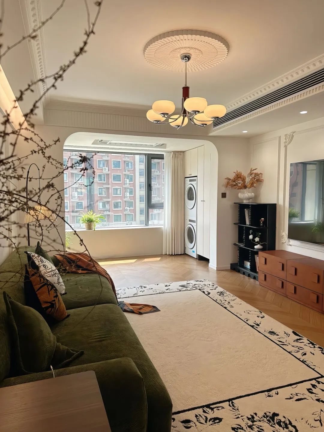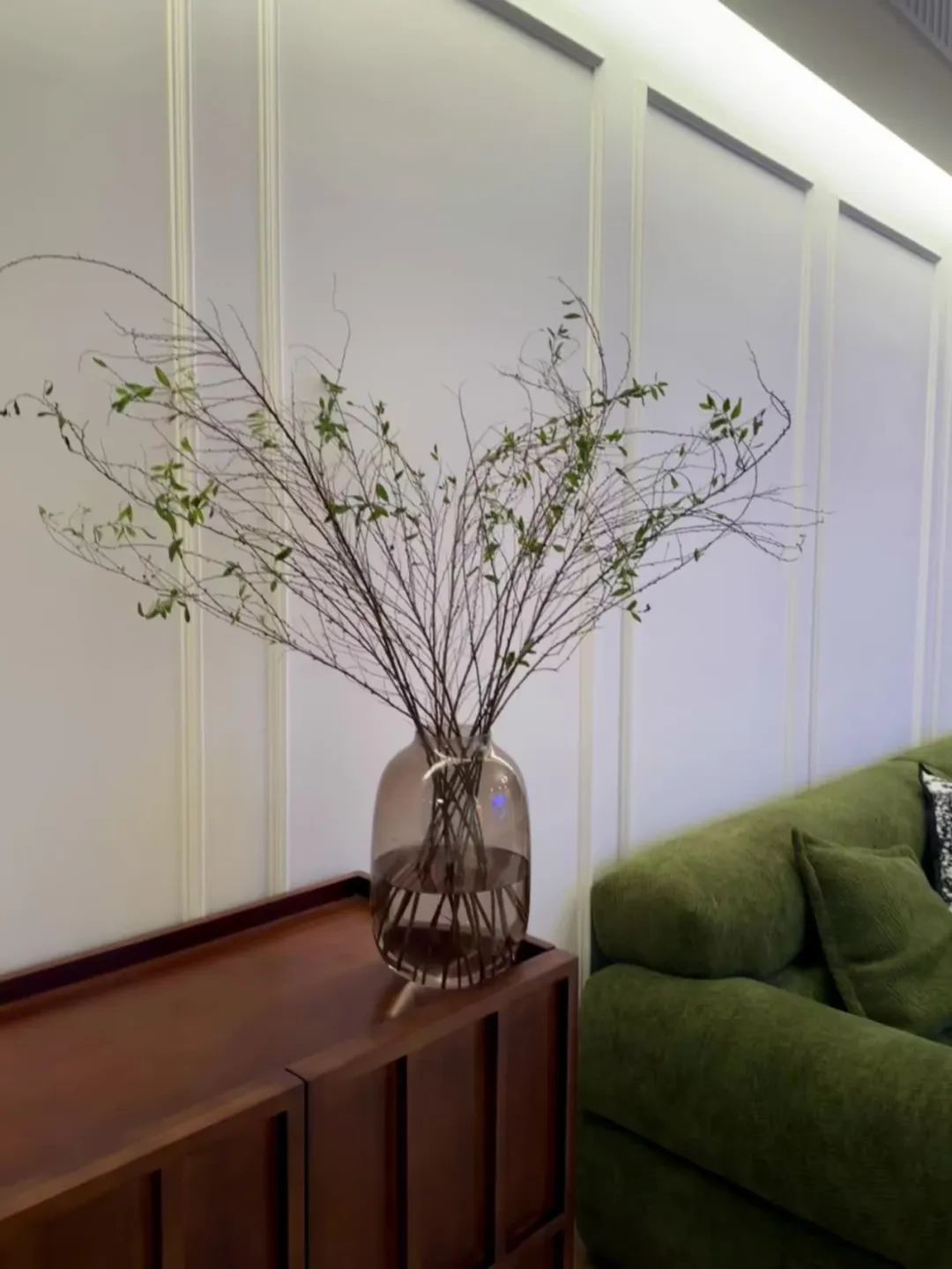 客厅开间3.7米,搭配复古绿色3米沙发