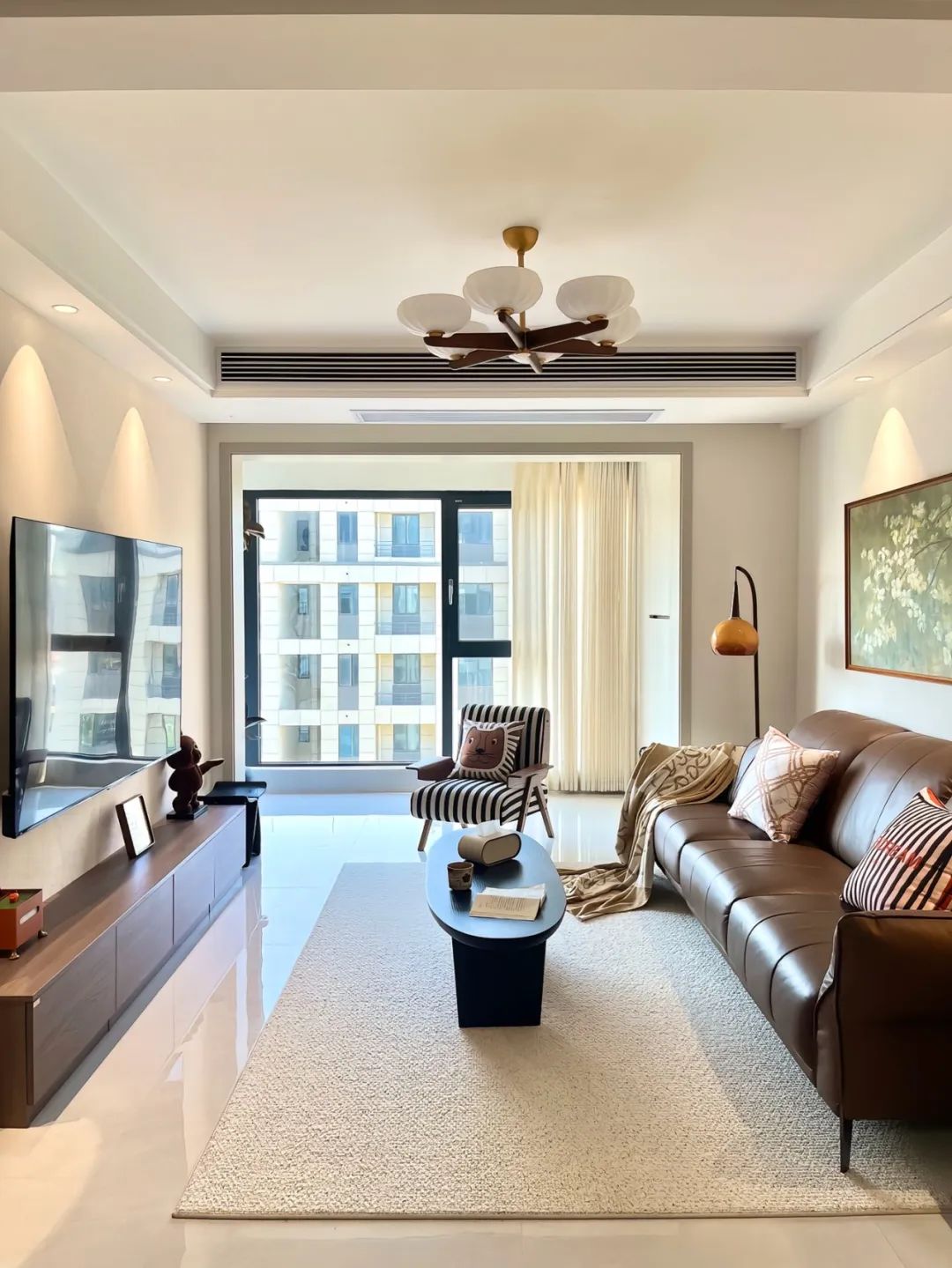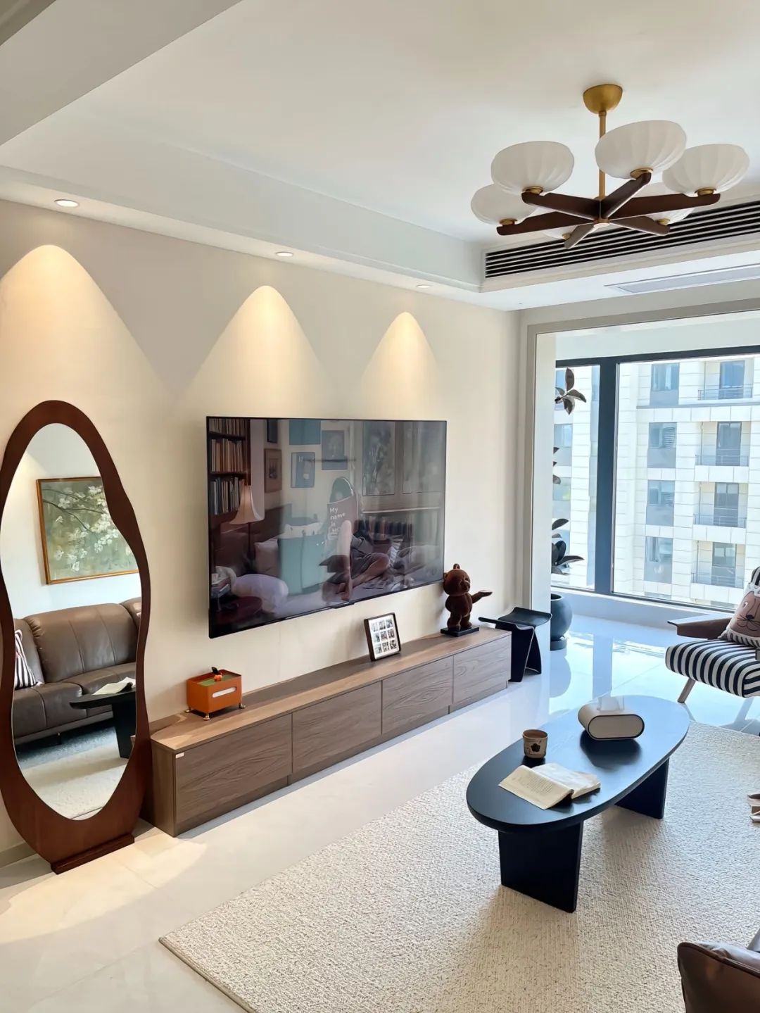 客厅开间3.4米,电视墙3.6米,电视柜是定制的2.4 米,电视是75寸。