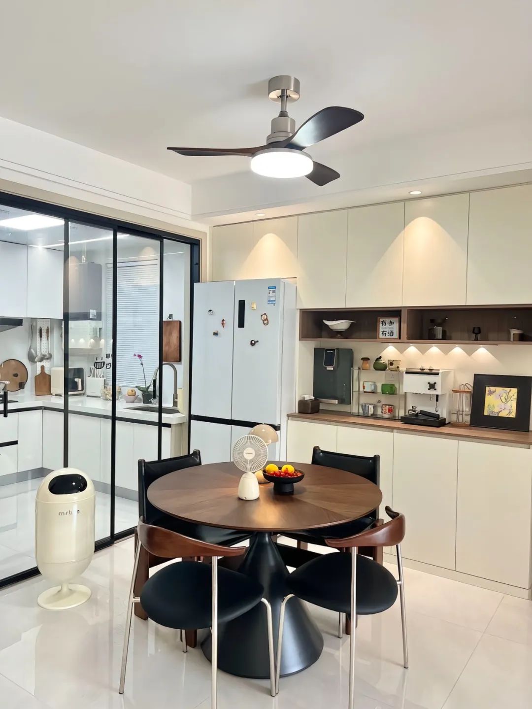 餐厅开间4.2米 ,做了一组餐边柜,1.1米的圆桌,好看实用且省空间。