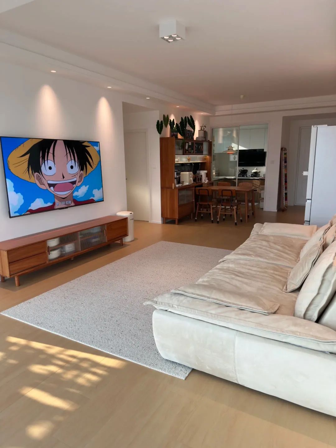 没有做复杂的背景墻,简单双眼皮边吊走一圈;颜色温润有质感奶白色的帆船沙发长度3米,没有要茶几。