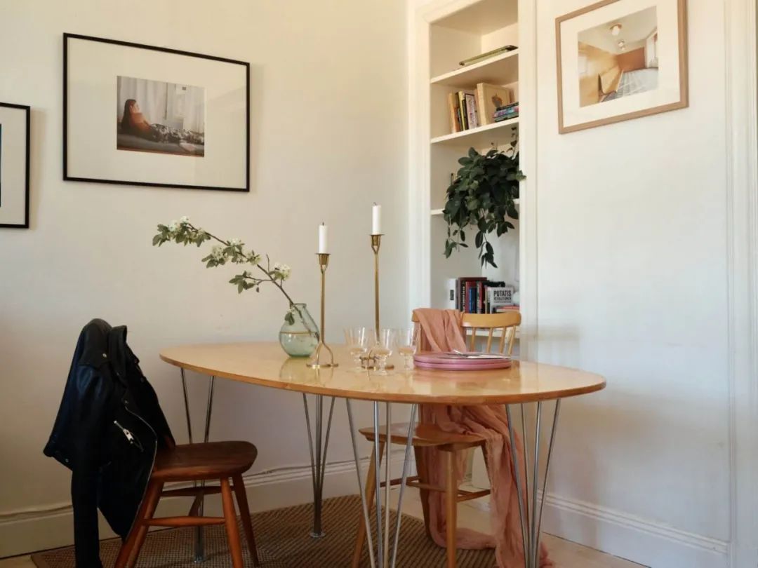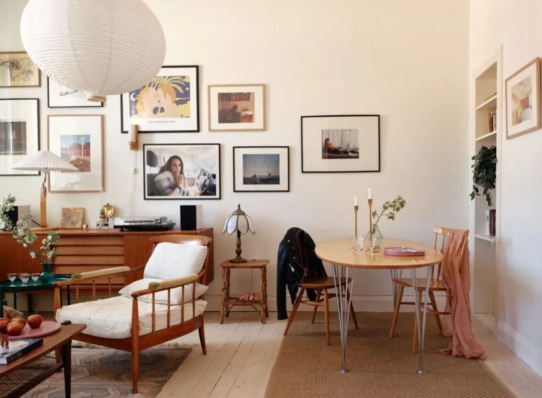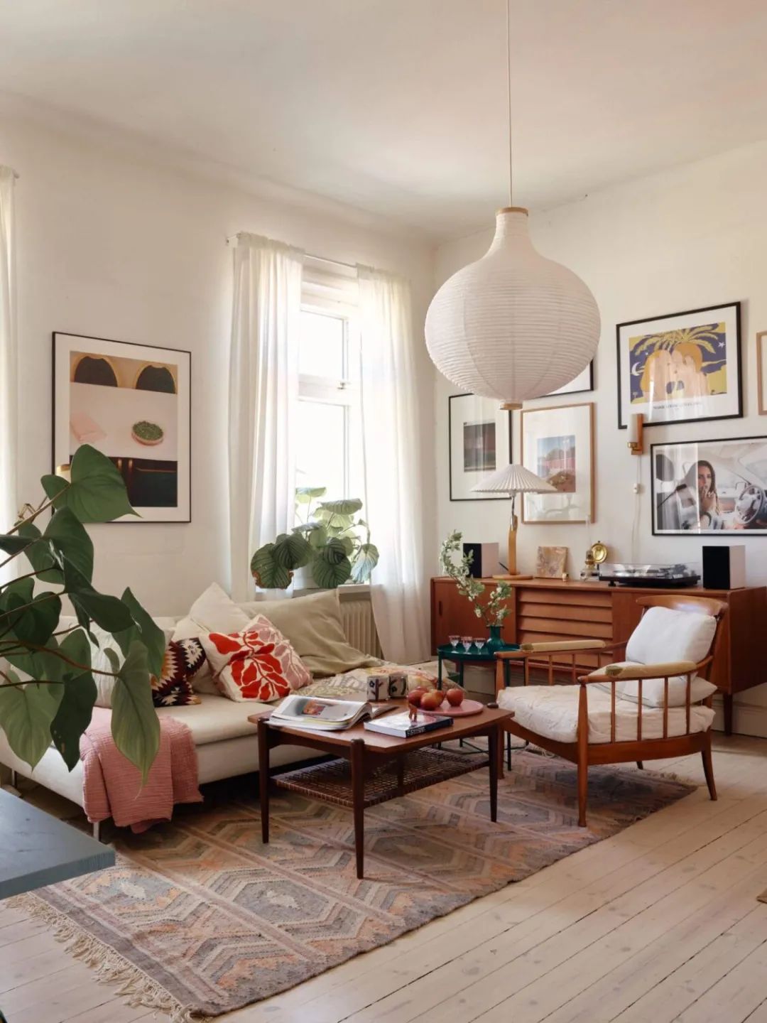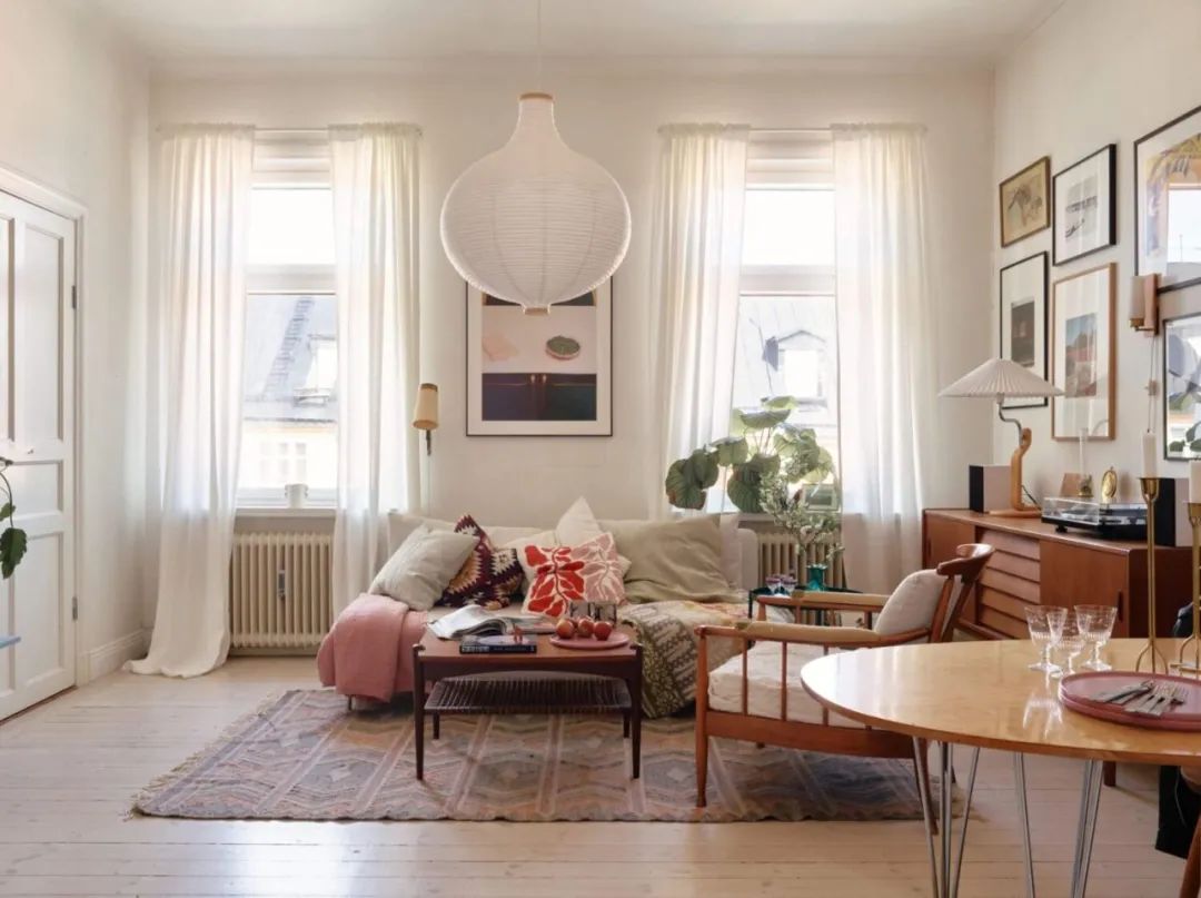 地板是经过白色染色处理的原始木板,搭配不同地毯划分出客厅区域和用餐区域。