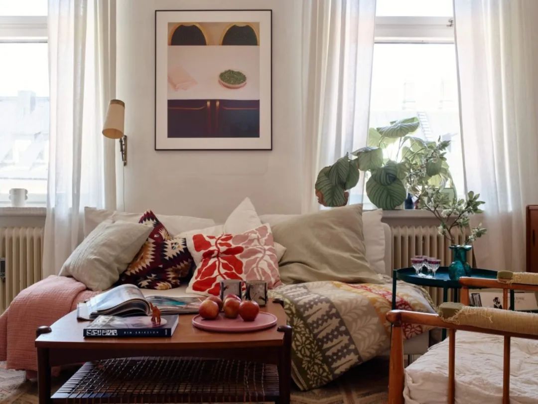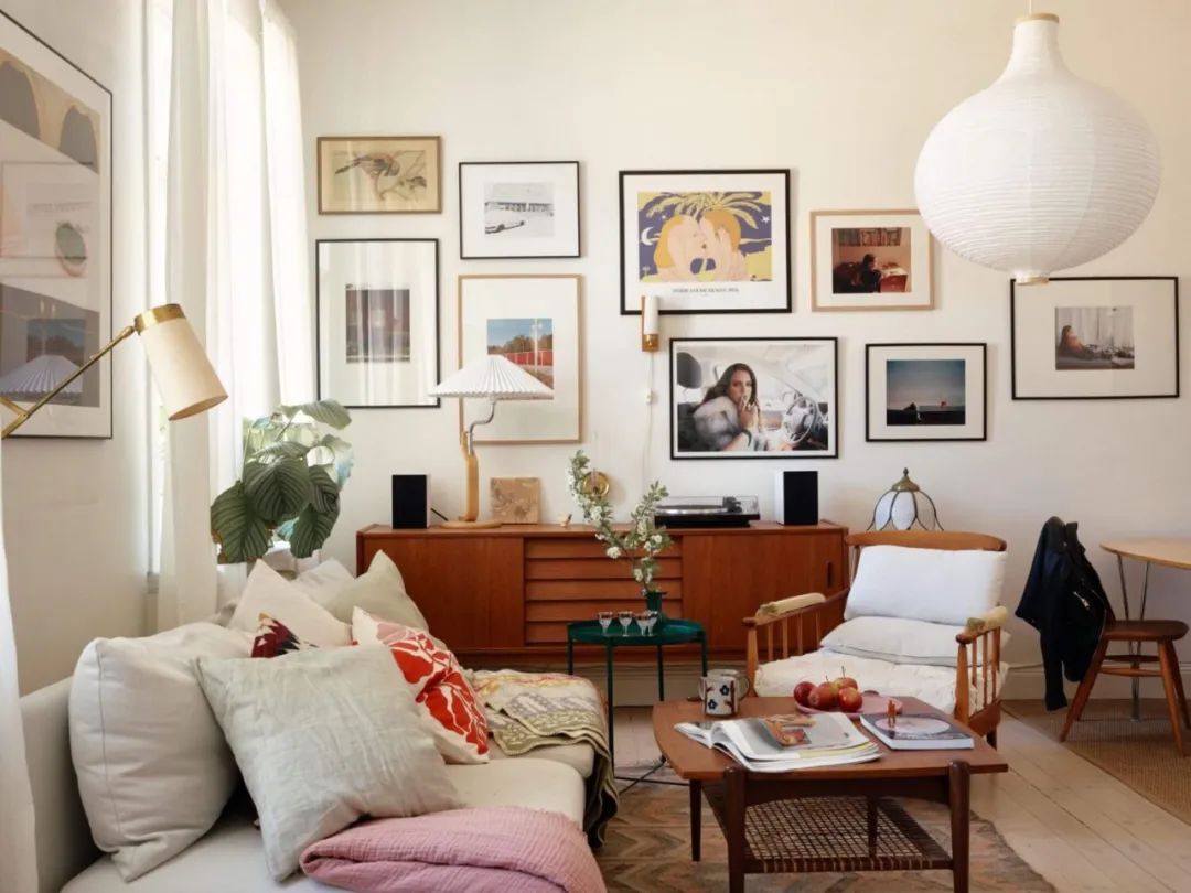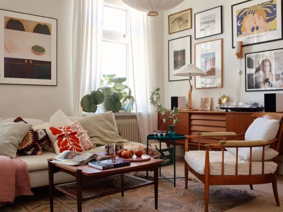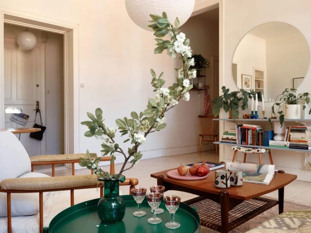 地板是经过白色染色处理的原始木板,搭配不同地毯划分出客厅区域和用餐区域。