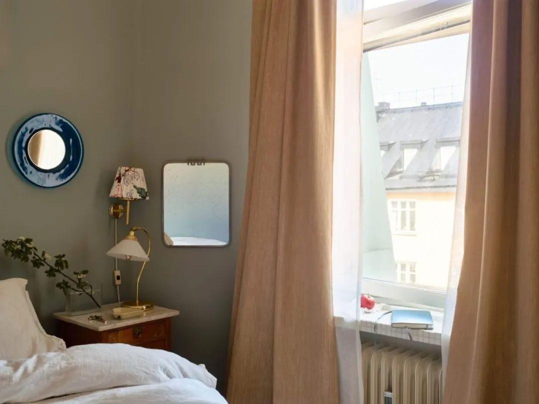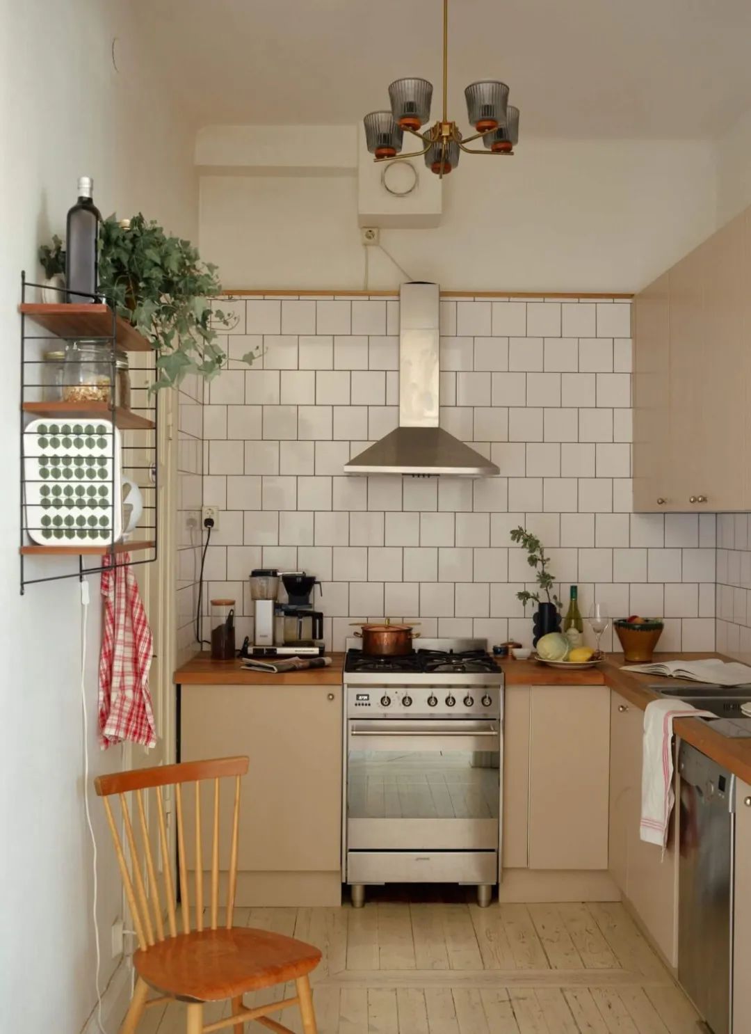 L型厨房的橱柜采用亚麻籽油涂料粉刷而成,地板上铺有防潮层压板。