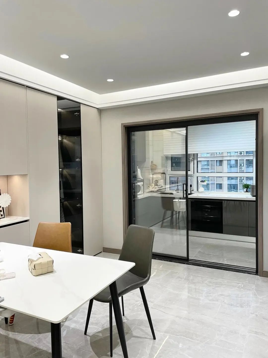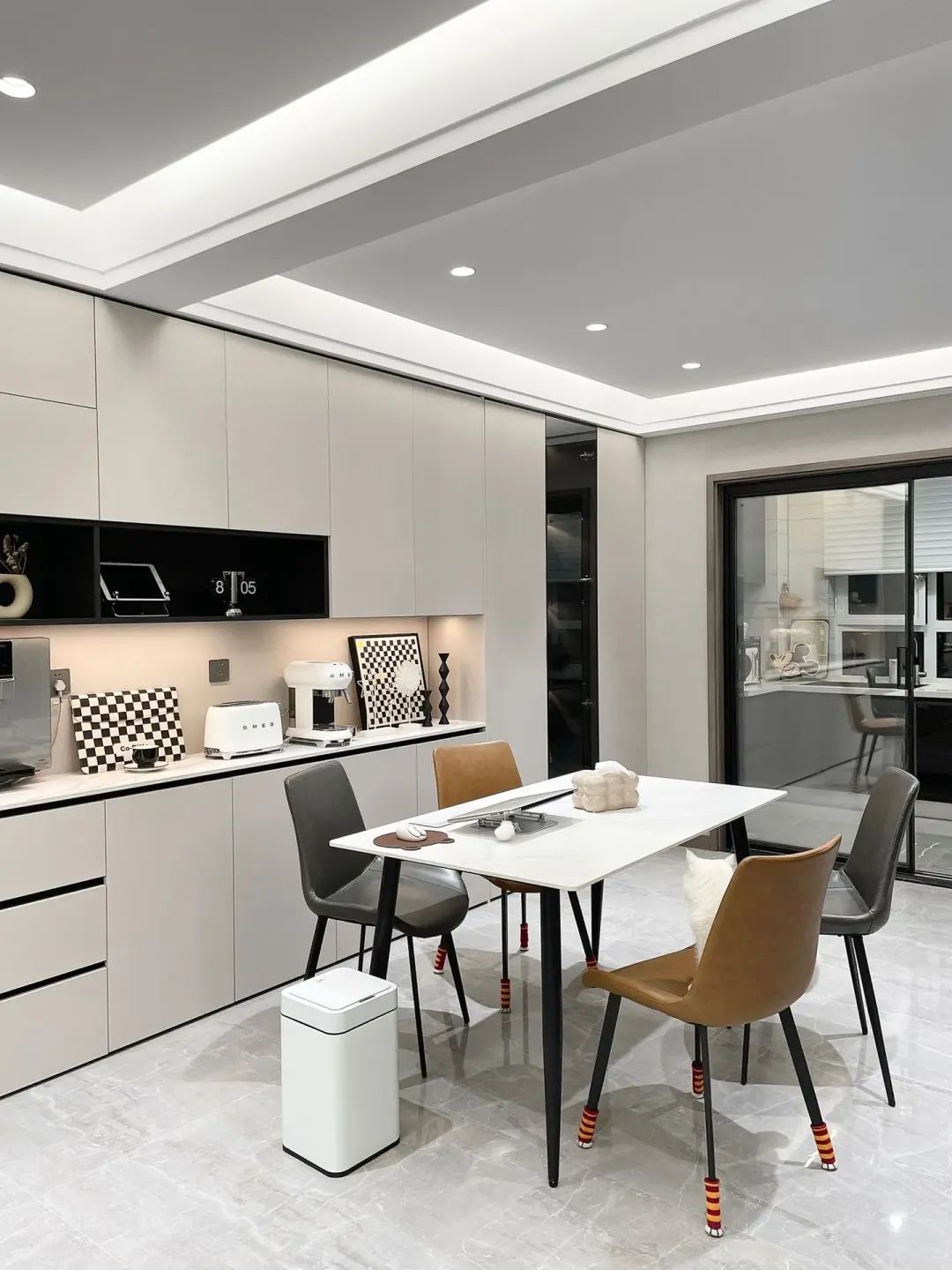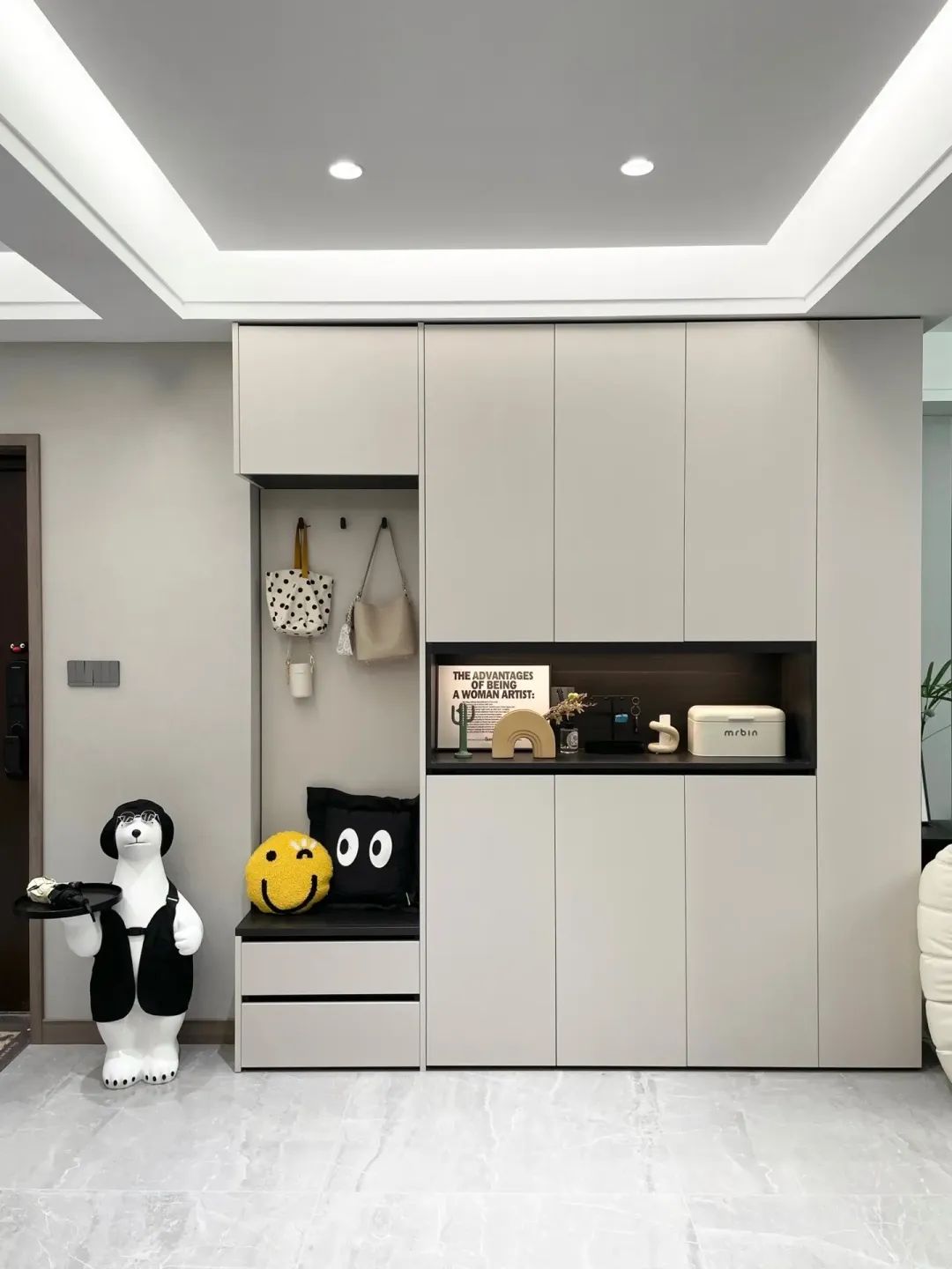 收纳一定要多,餐厅做了满墙的餐边柜和鞋柜,满足收纳需求。