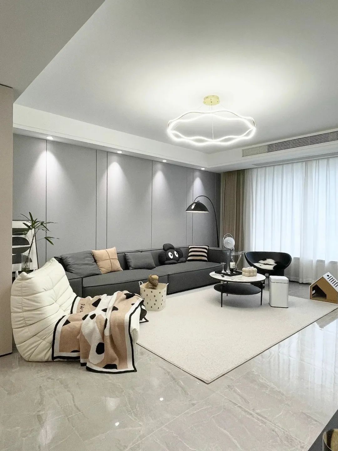 餐厅有梁就做了无主灯,客厅就简单只做了边吊。