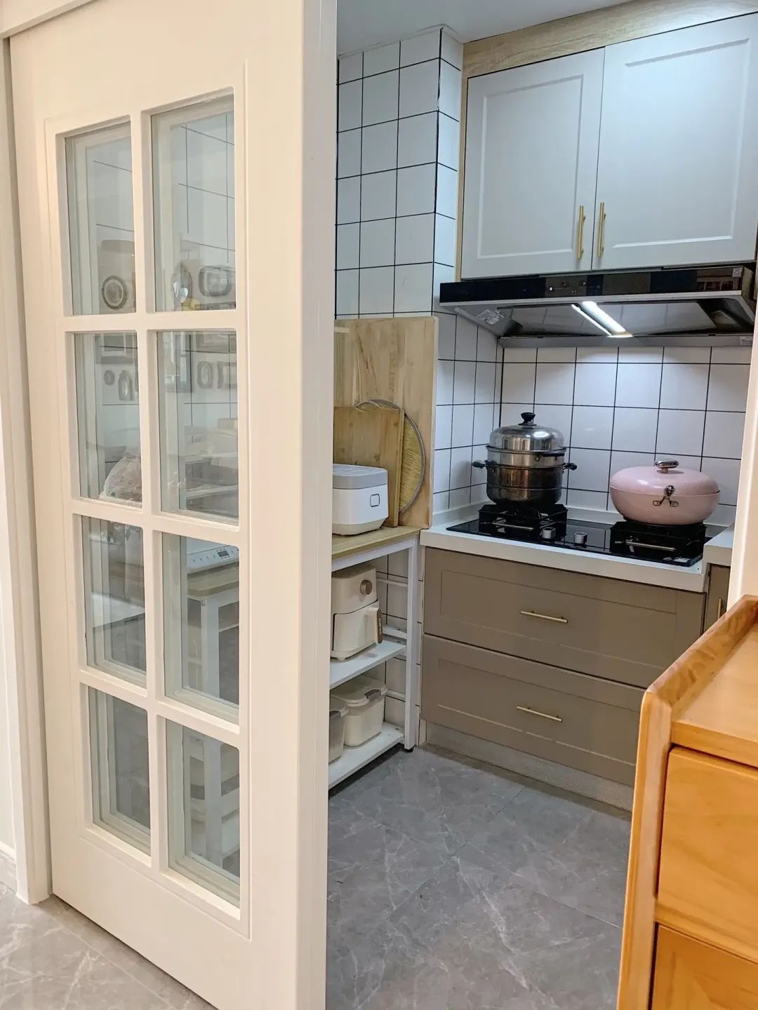 厨房只有4个多平,做的白色复合实木门推拉门