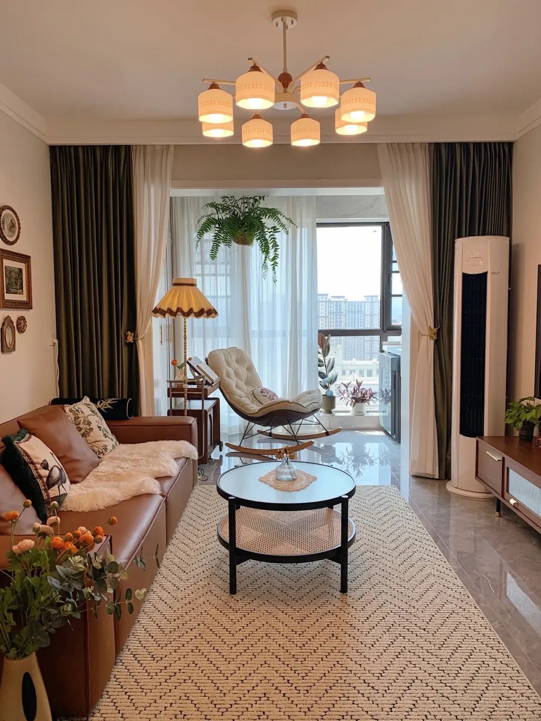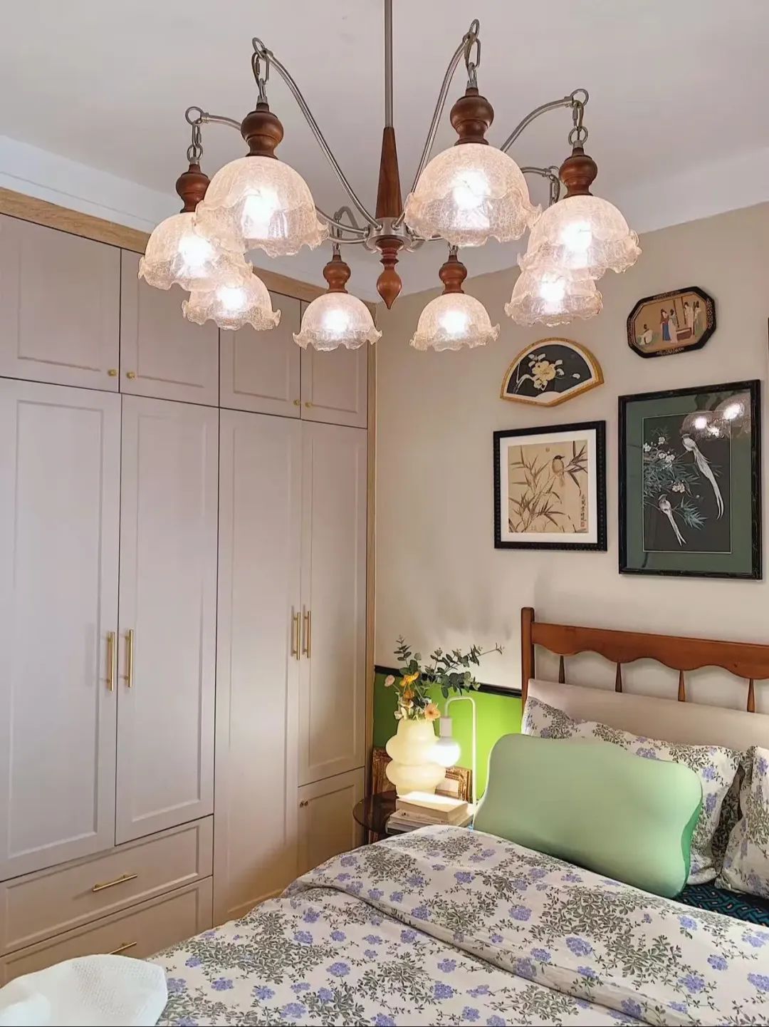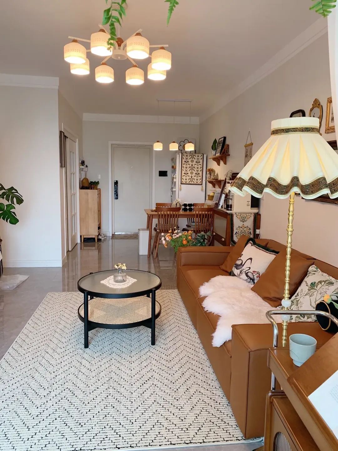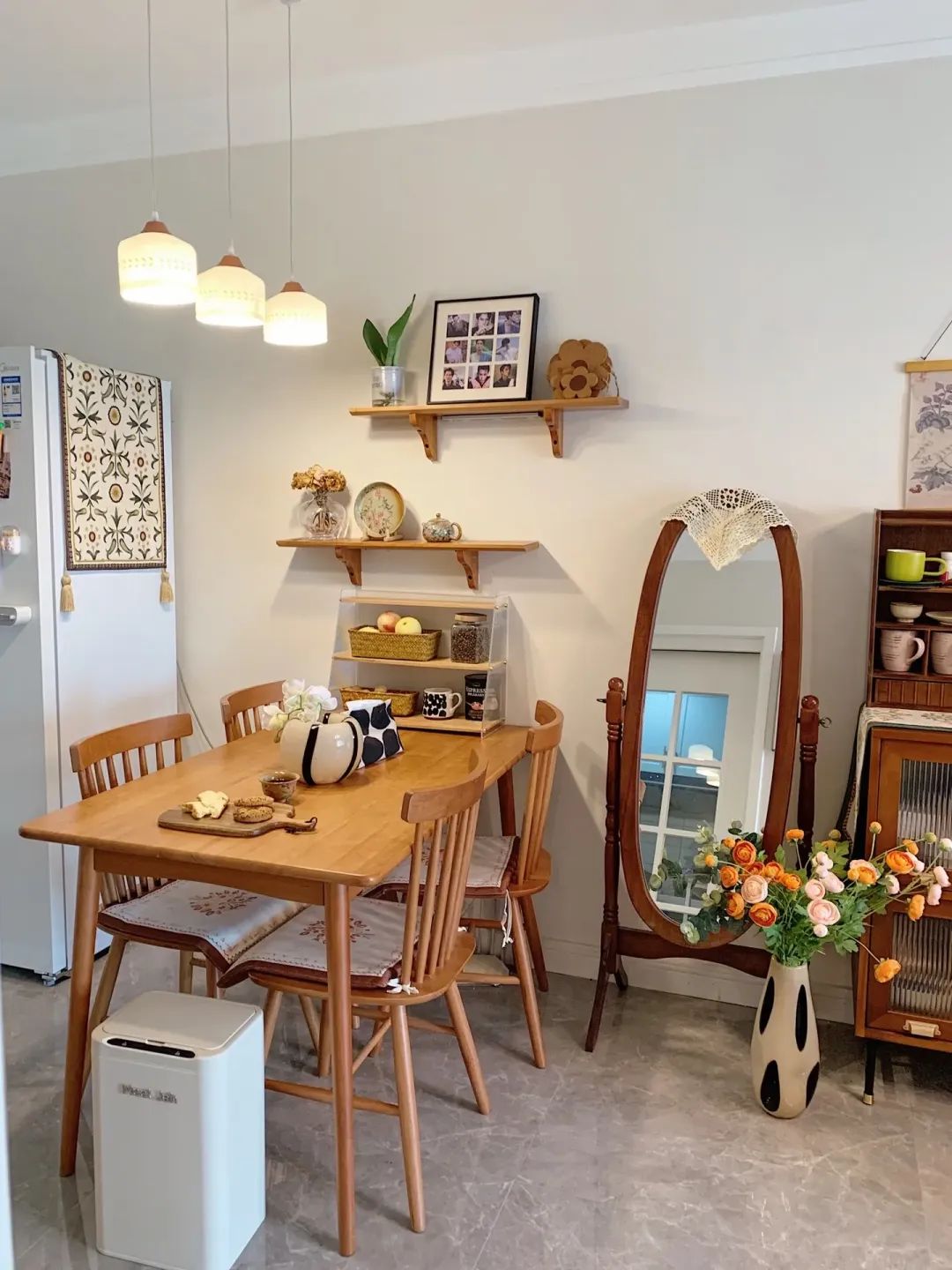 餐厅区域樱桃木,搭配一组白色陶瓷复古吊灯,增加层次