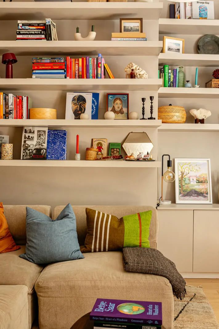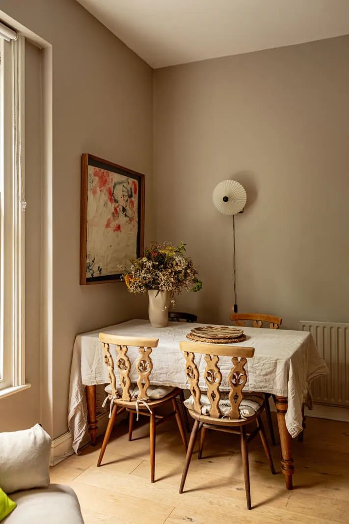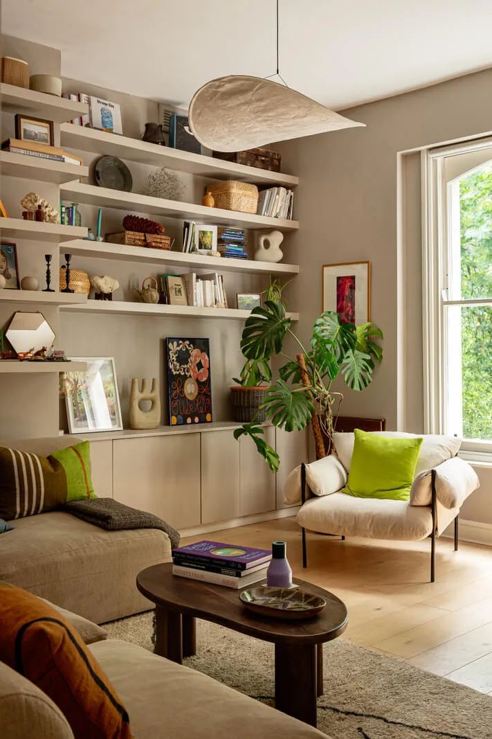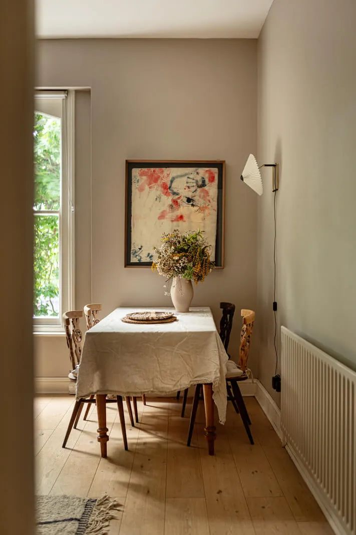 客厅采用宽橡木地板,墙壁刷成了浅灰色