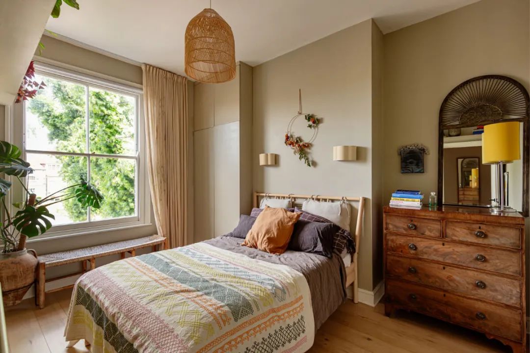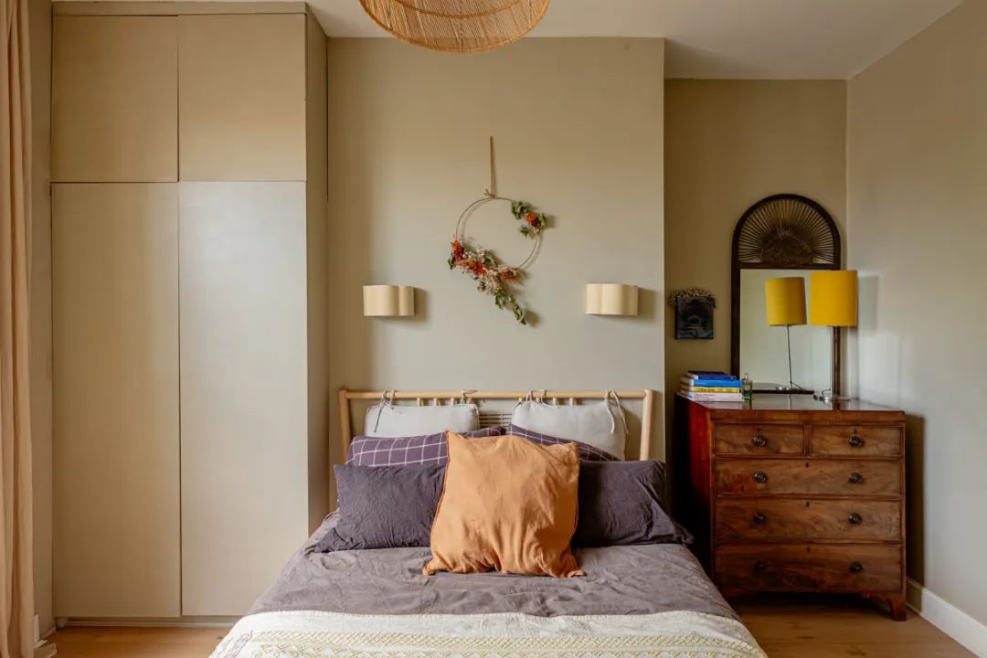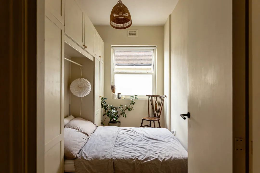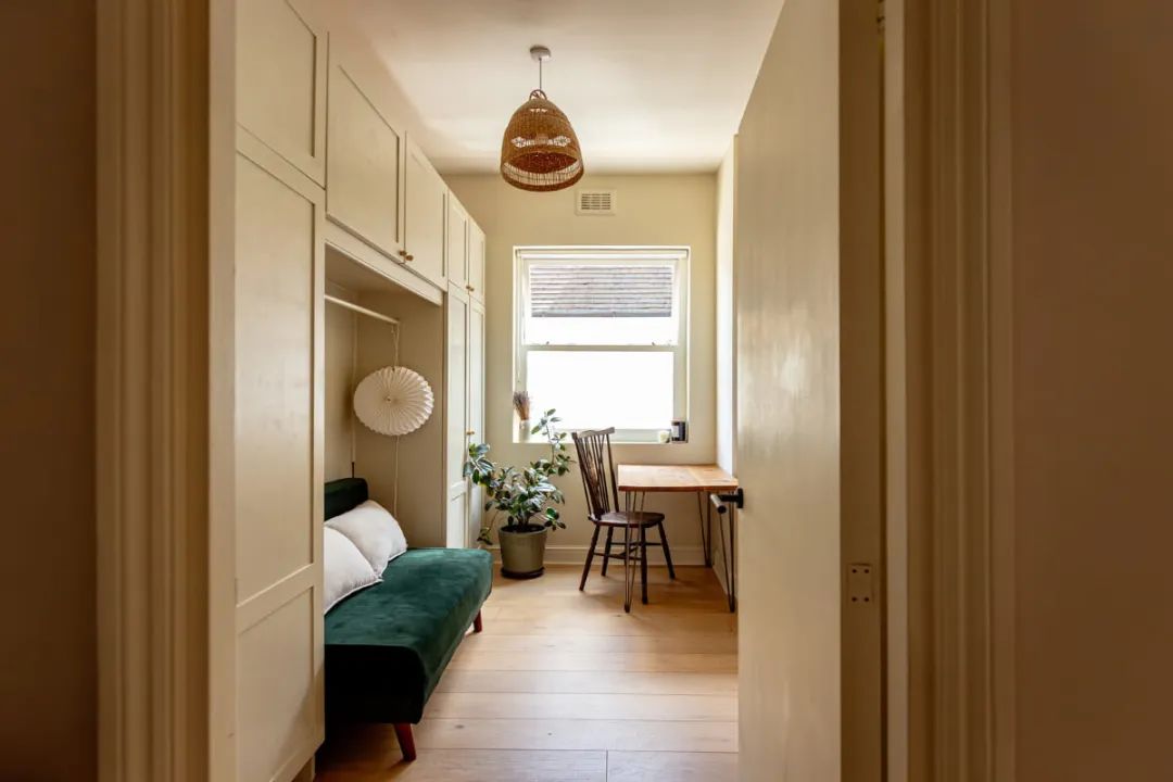第二间卧室功能多样,配有嵌入式衣柜,衣柜之间还放置了一张沙发。