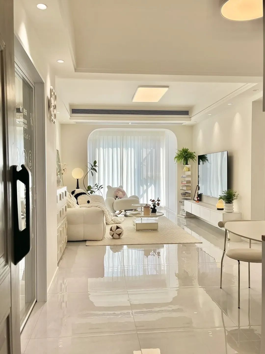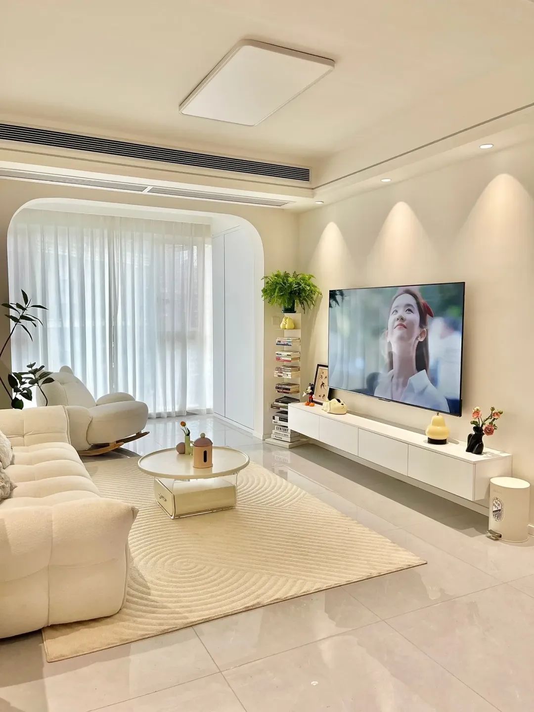 客厅通铺浅灰色地砖,无门槛石弧形拱门,通刷奶油色乳胶漆