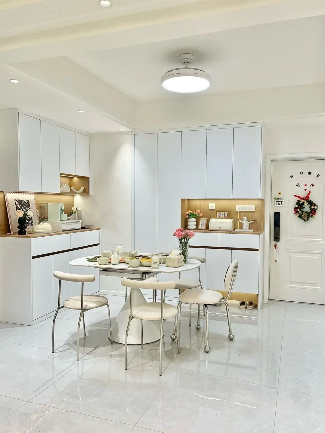 餐厅区域放了方圆两用的餐桌很实用,餐桌是1.2m,方桌可变圆桌,收起不占空间。厨房5平方小厨房,L型布局卧室卫生间如您有全屋翻新丨厨卫改造丨墙面焕新等旧房改造需求欢迎致电全国统一服务热线400-808-8836