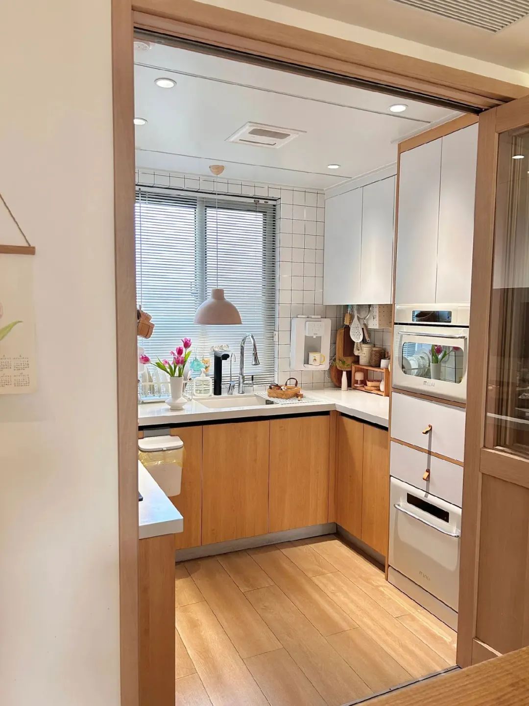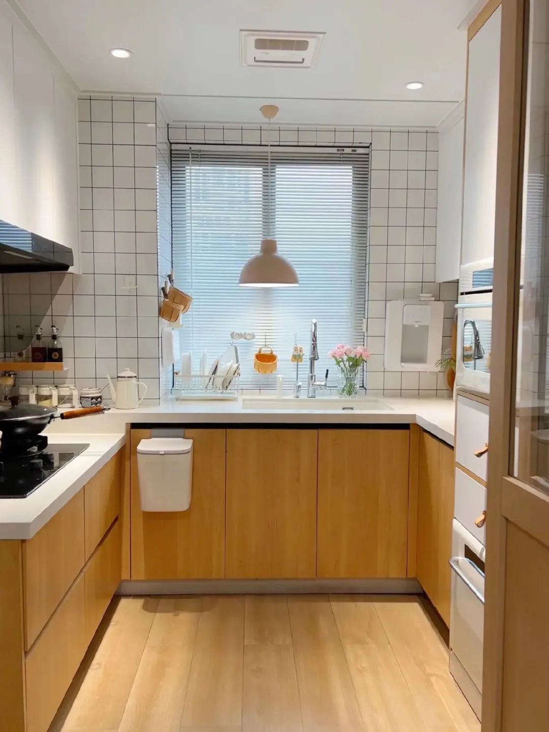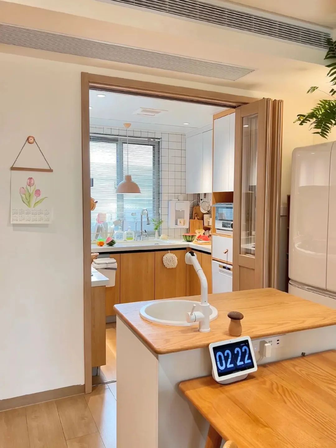 4平米小厨房,在厨房外面做了一个实木台面的岛台,使用折叠门,既避免了油烟问题,又避免了传统推拉门占位置且有卫生死角,厨房通透又敞亮。