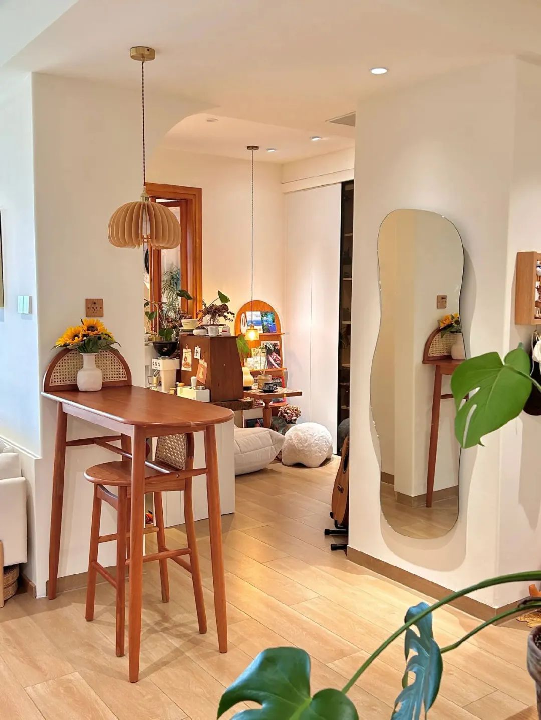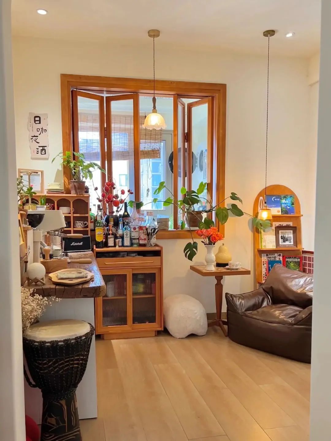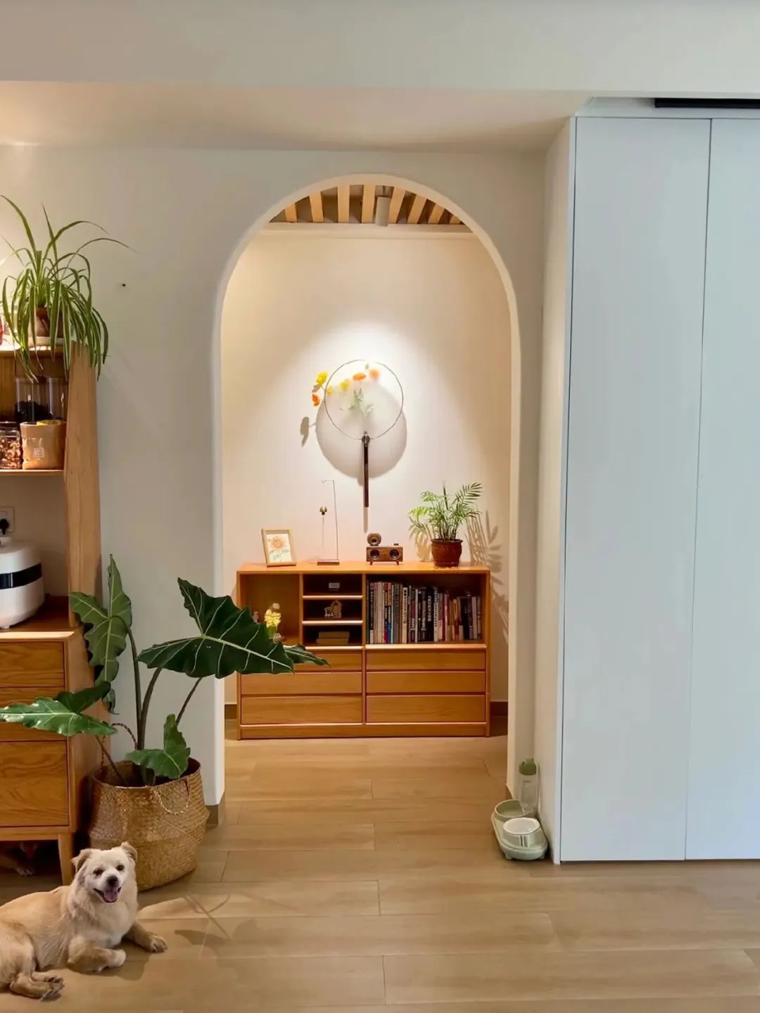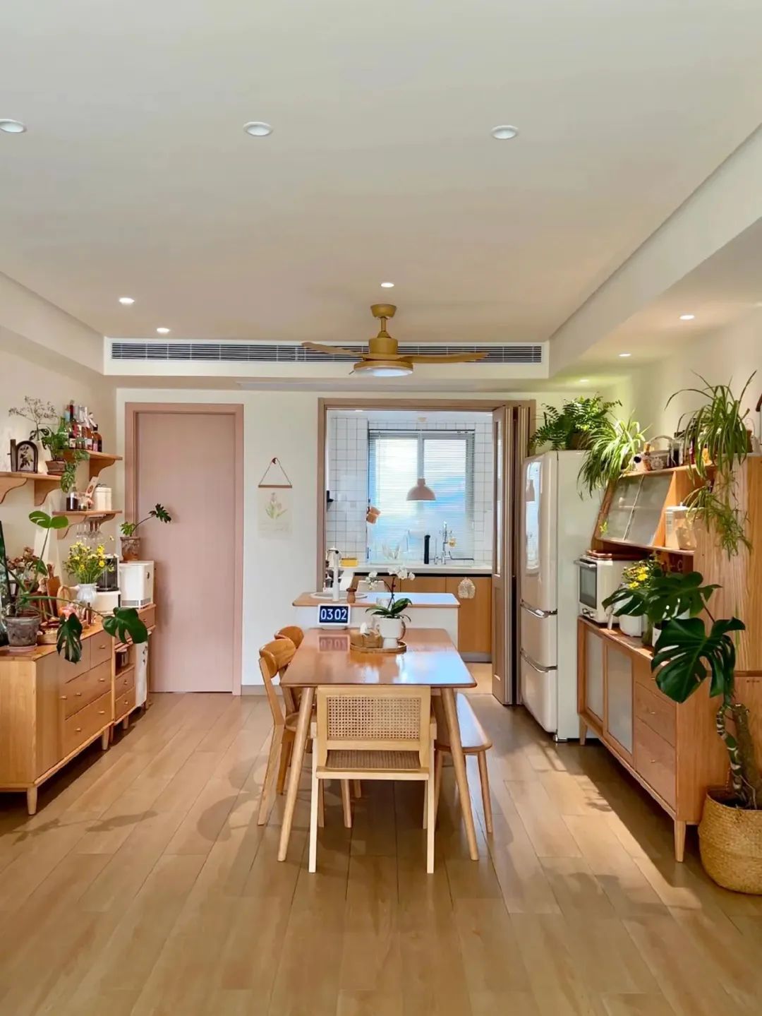 4平米小厨房,在厨房外面做了一个实木台面的岛台,使用折叠门,既避免了油烟问题,又避免了传统推拉门占位置且有卫生死角,厨房通透又敞亮。
