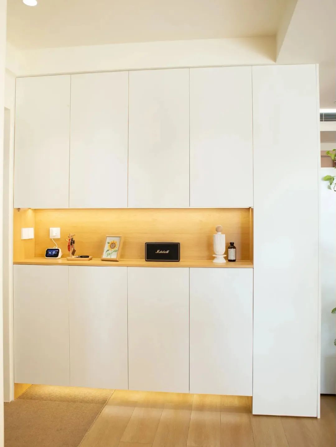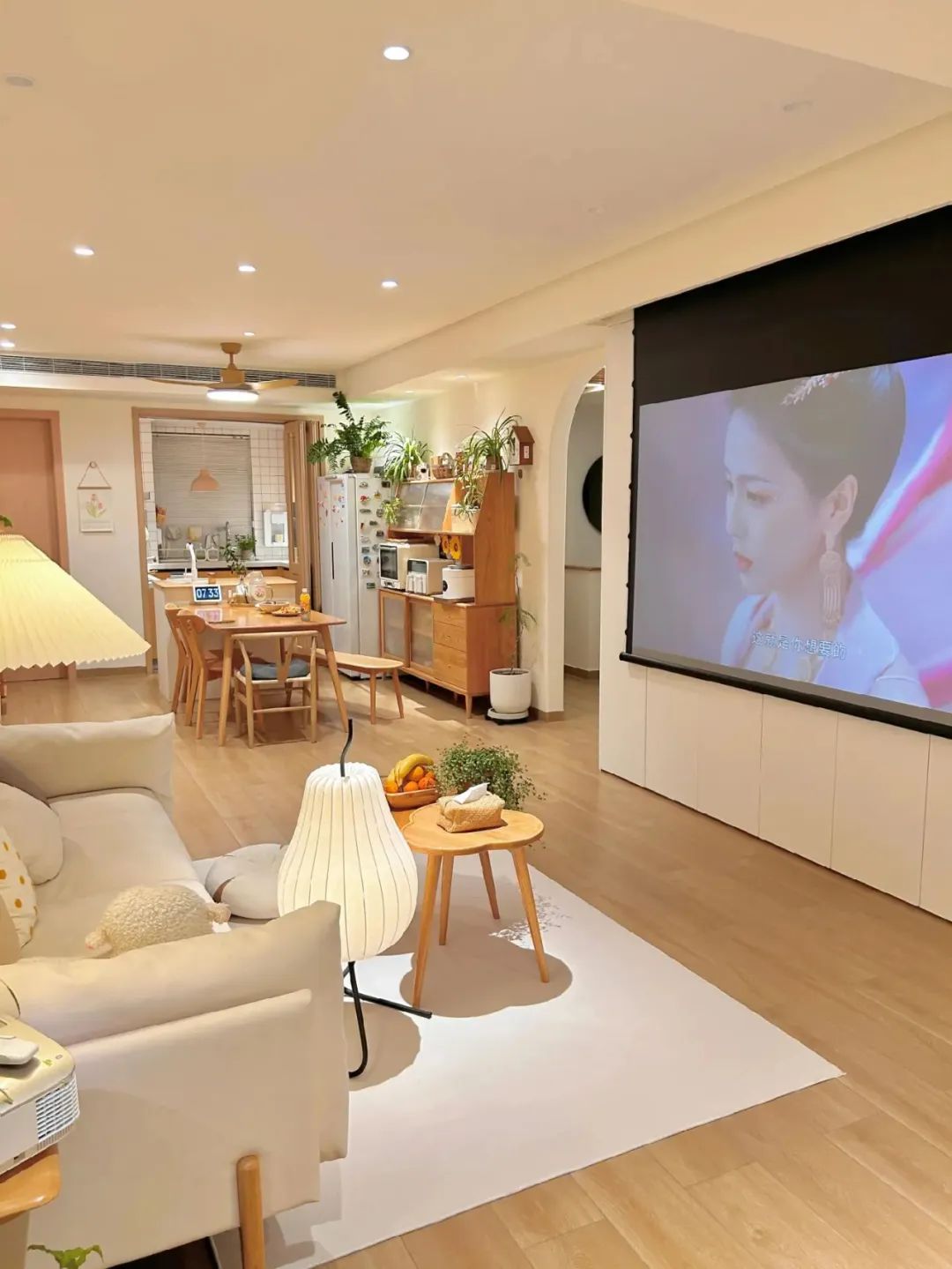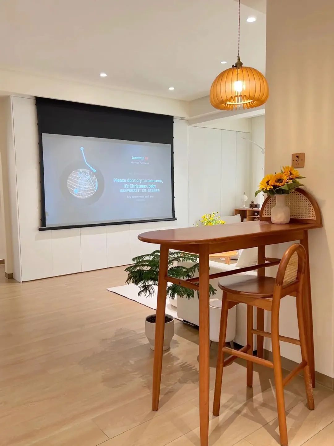 客厅开间3.8米,沙发2.4米,沙发旁边放置宽65cm的实木斗柜,没有电视墙,打了一排柜子,安装了投影幕布。