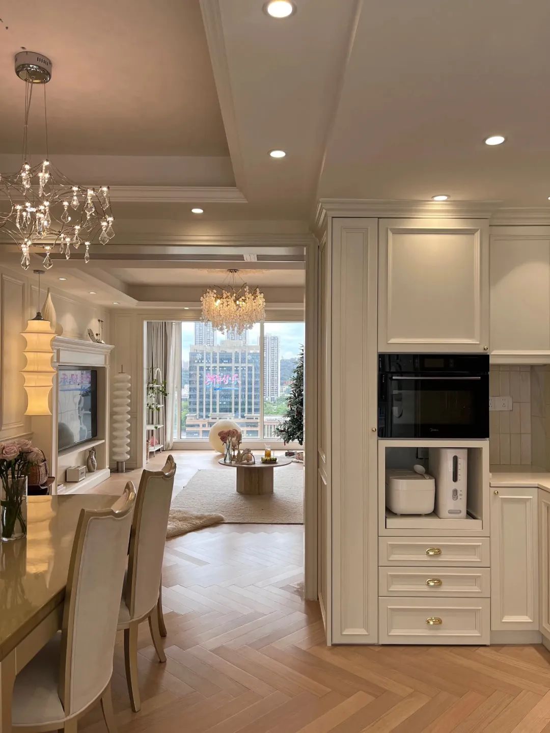 人字拼木地板全屋通铺,浅色地毯和奶油沙发相辅相成。餐厅厨房厨房和餐厅是联动的餐厨一体,扩大了餐厅和厨房的是使用面积,更显通透。衣帽间卧室卫生间如您有全屋翻新丨厨卫改造丨墙面焕新等旧房改造需求欢迎致电全国统一服务热线400-808-8836