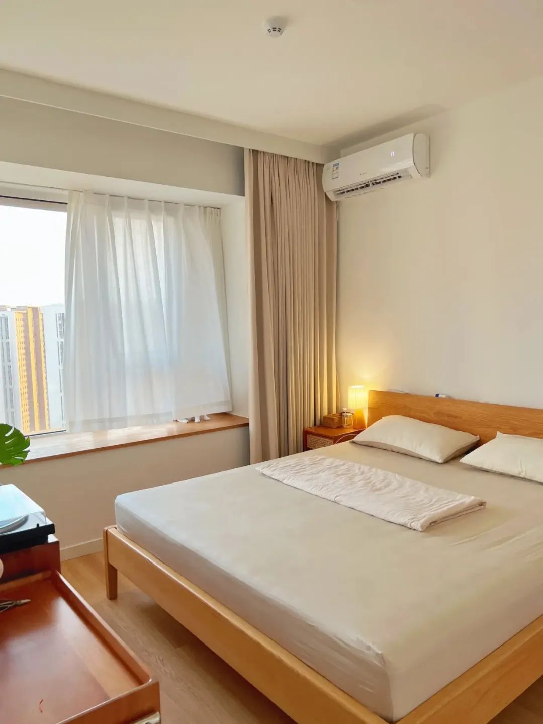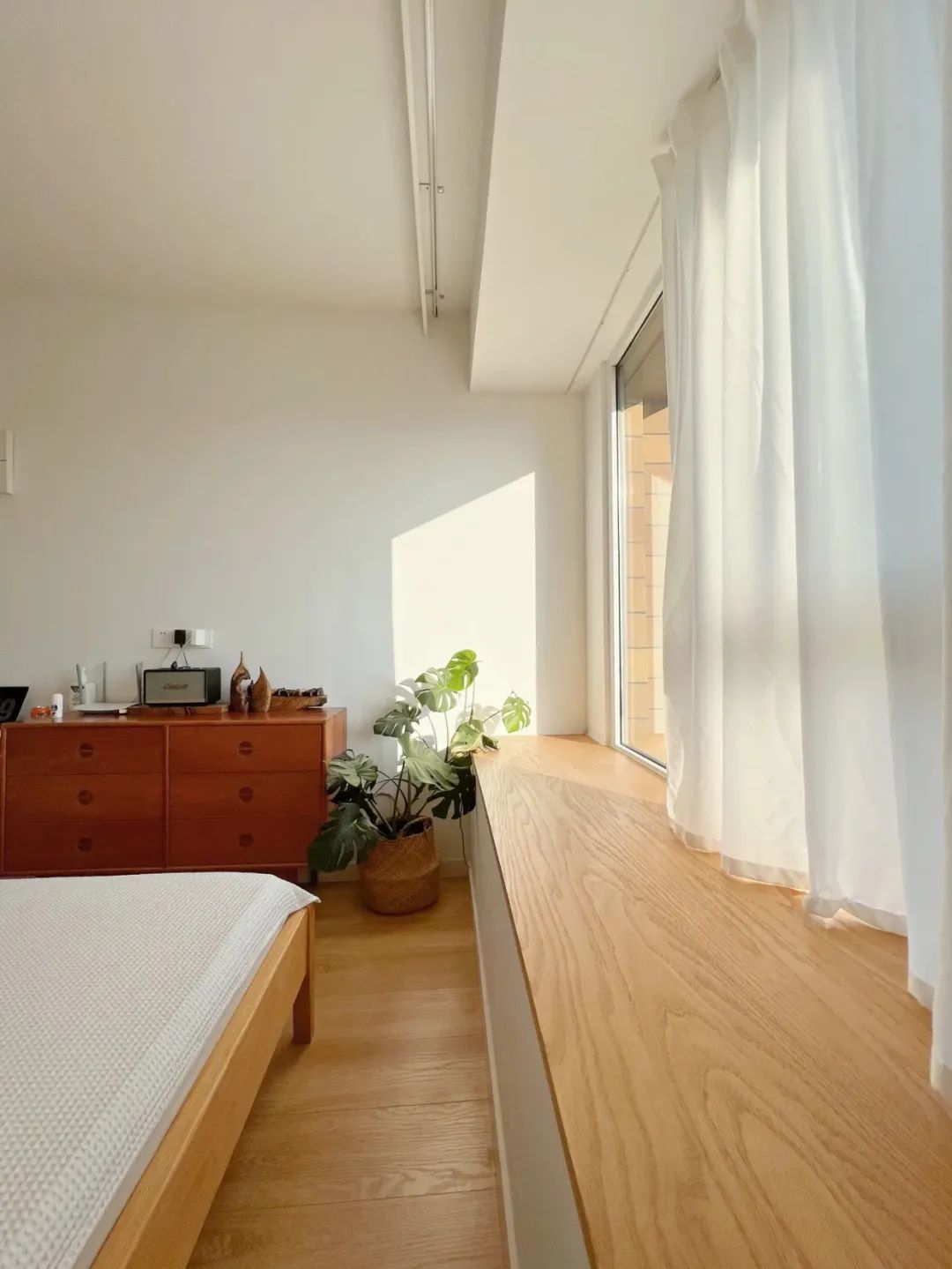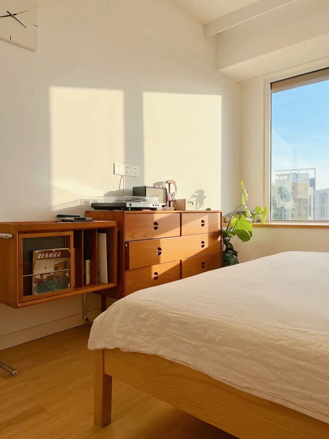 卧室,没有吊顶,没有软包,也没有大衣柜。全屋大白墙+木地板。做了一张实木床和一大块实木飘窗,床尾放了个斗柜和边柜用来收纳小件,虽然简单,但非常舒服。