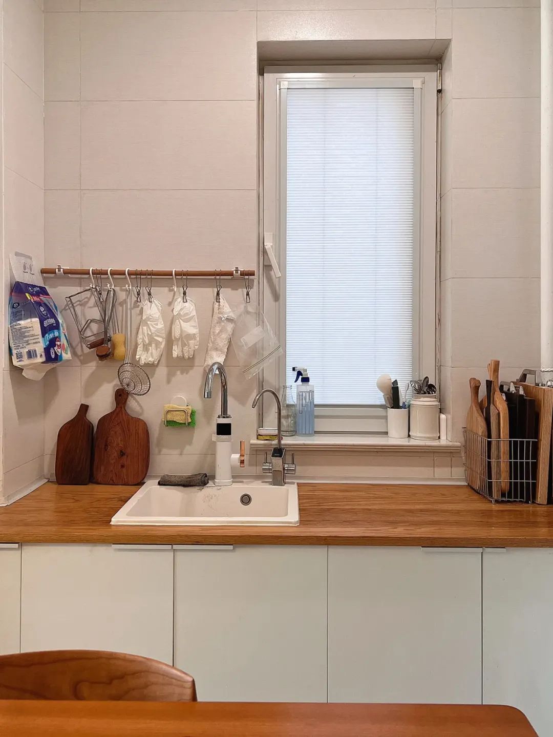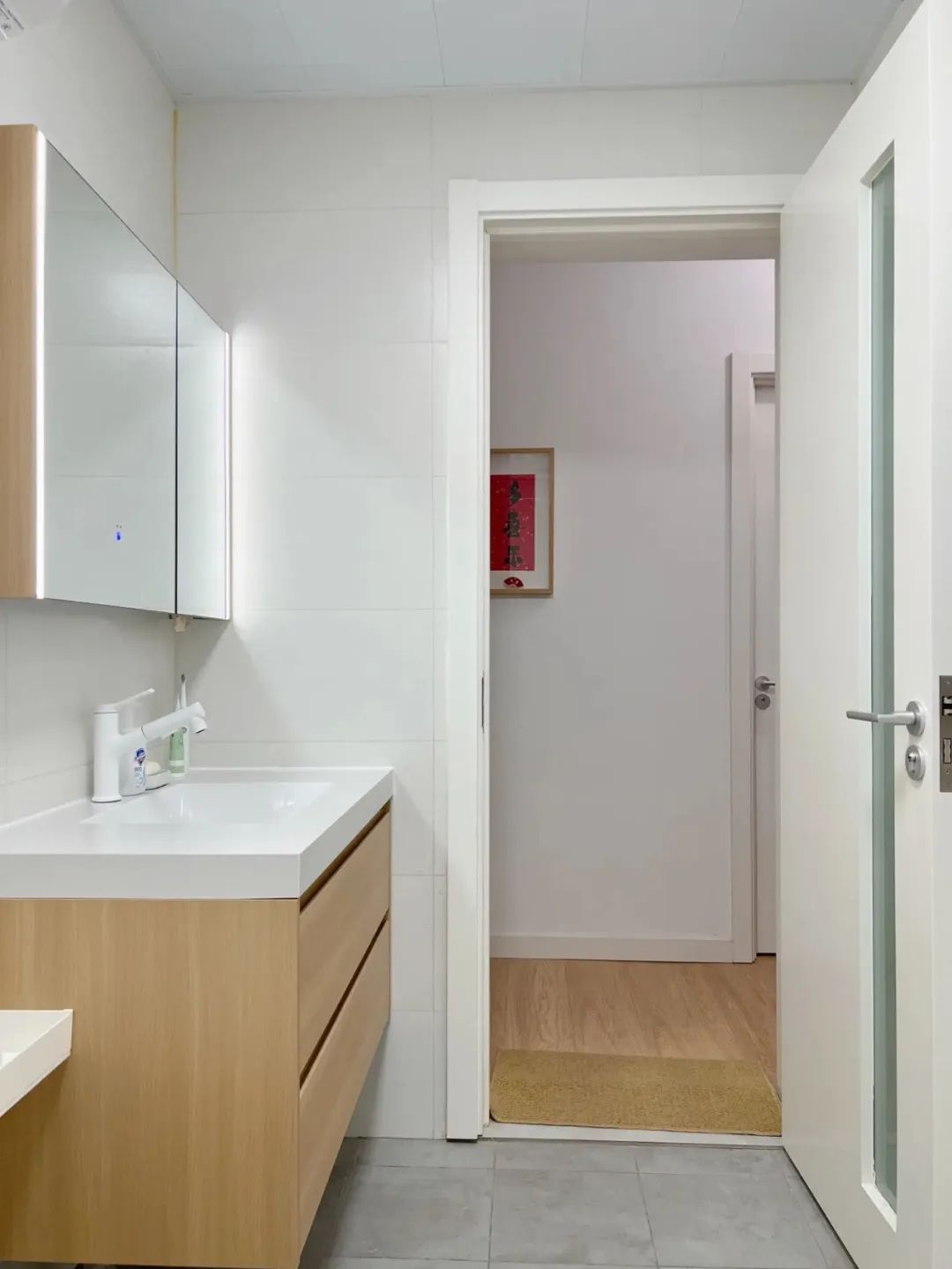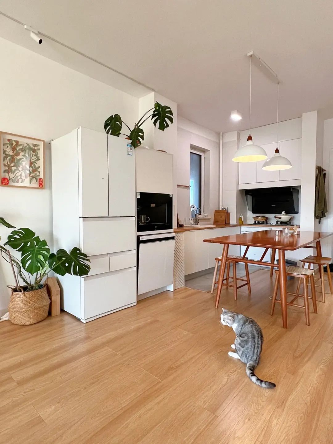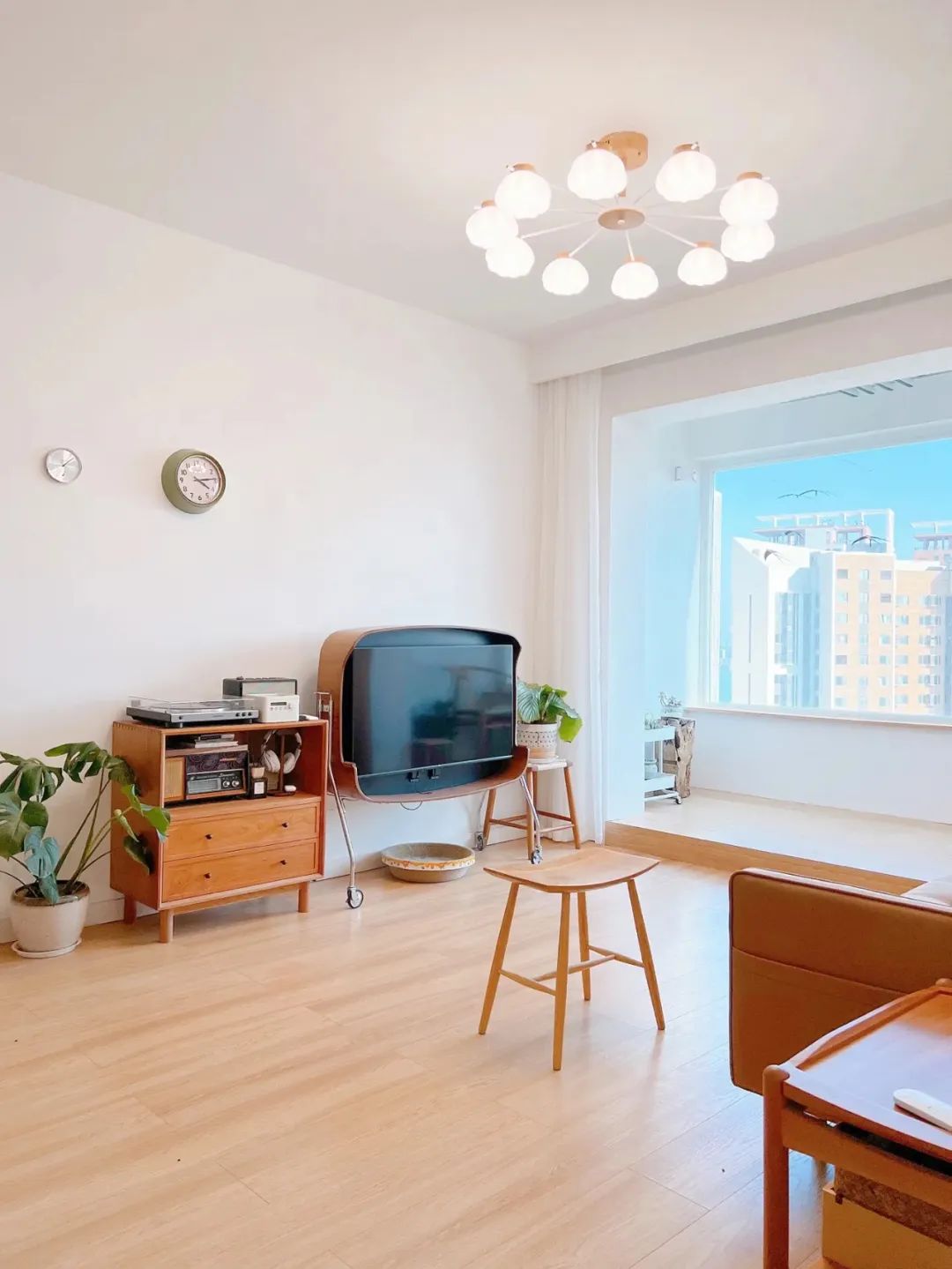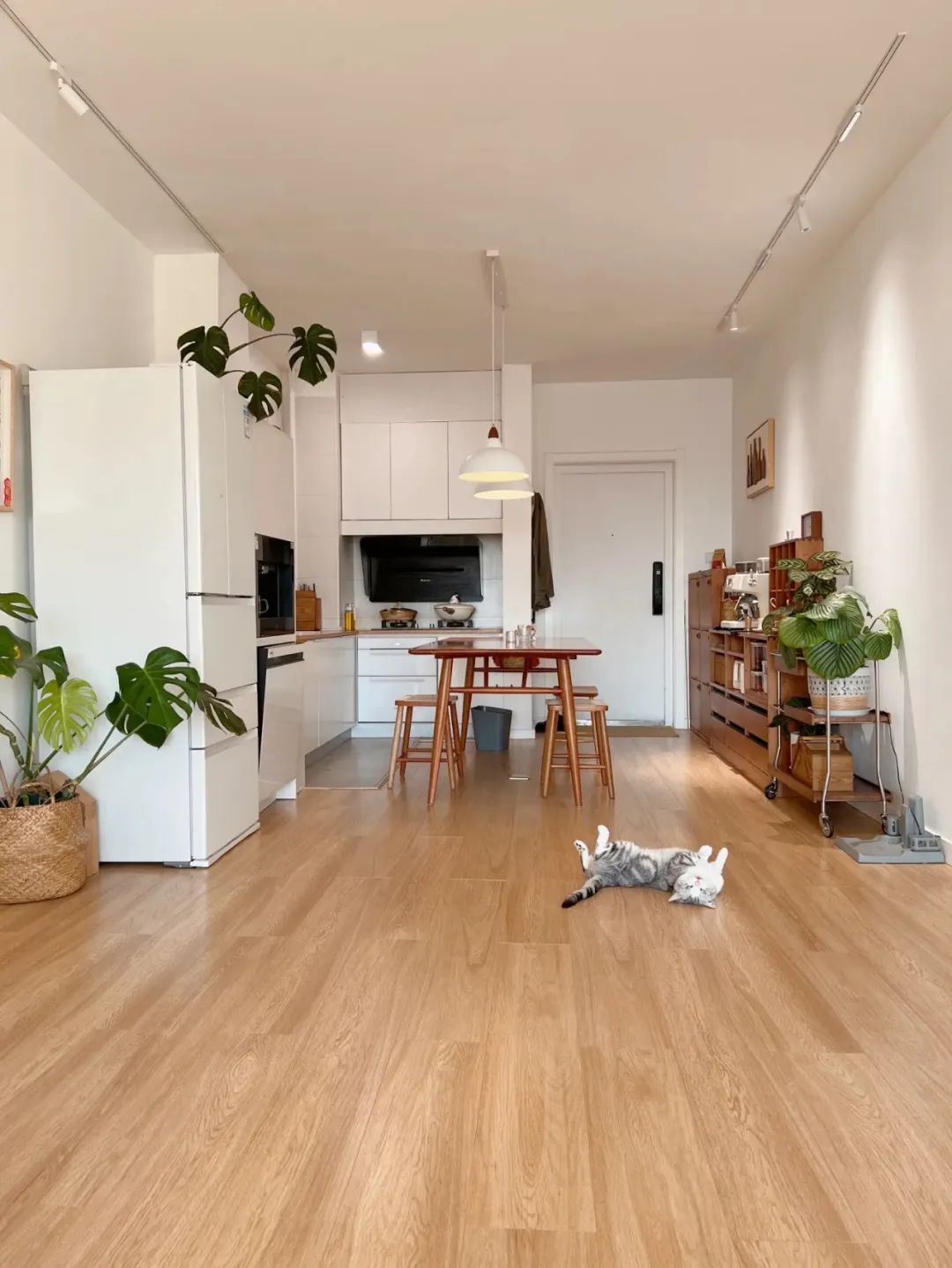 全屋木地板通铺,保留大白墙;阳台拆除推拉门,做了地台;70平也很显大
