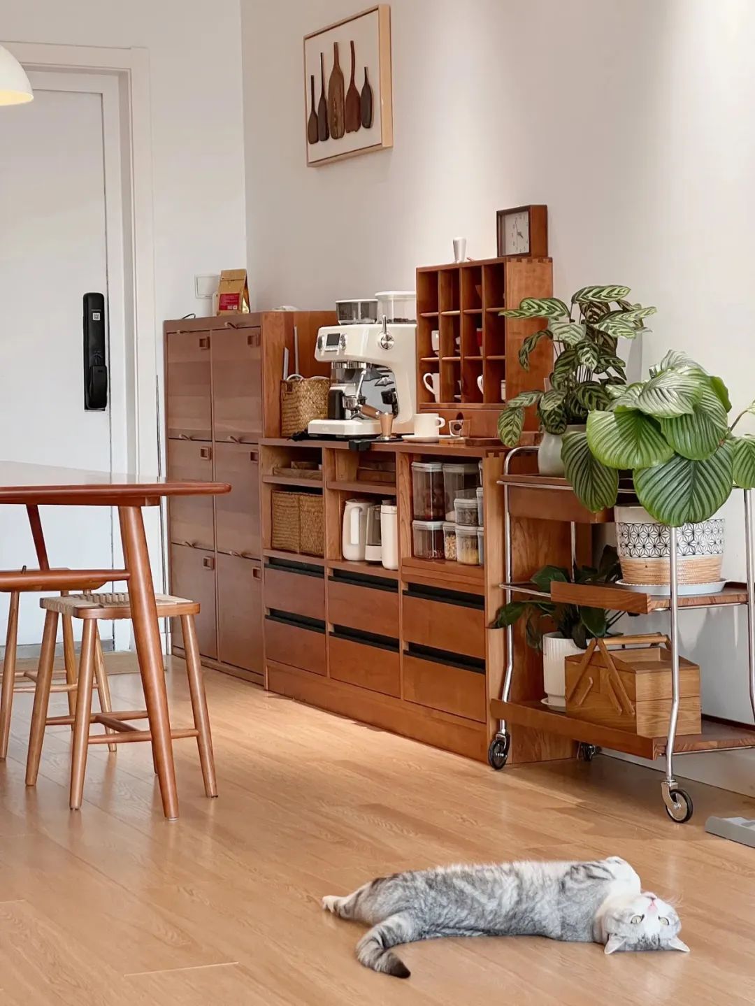 餐厅客厅连在一起,墙边放了一组餐边矮柜,既能收纳餐厅杂物,又很有氛围感