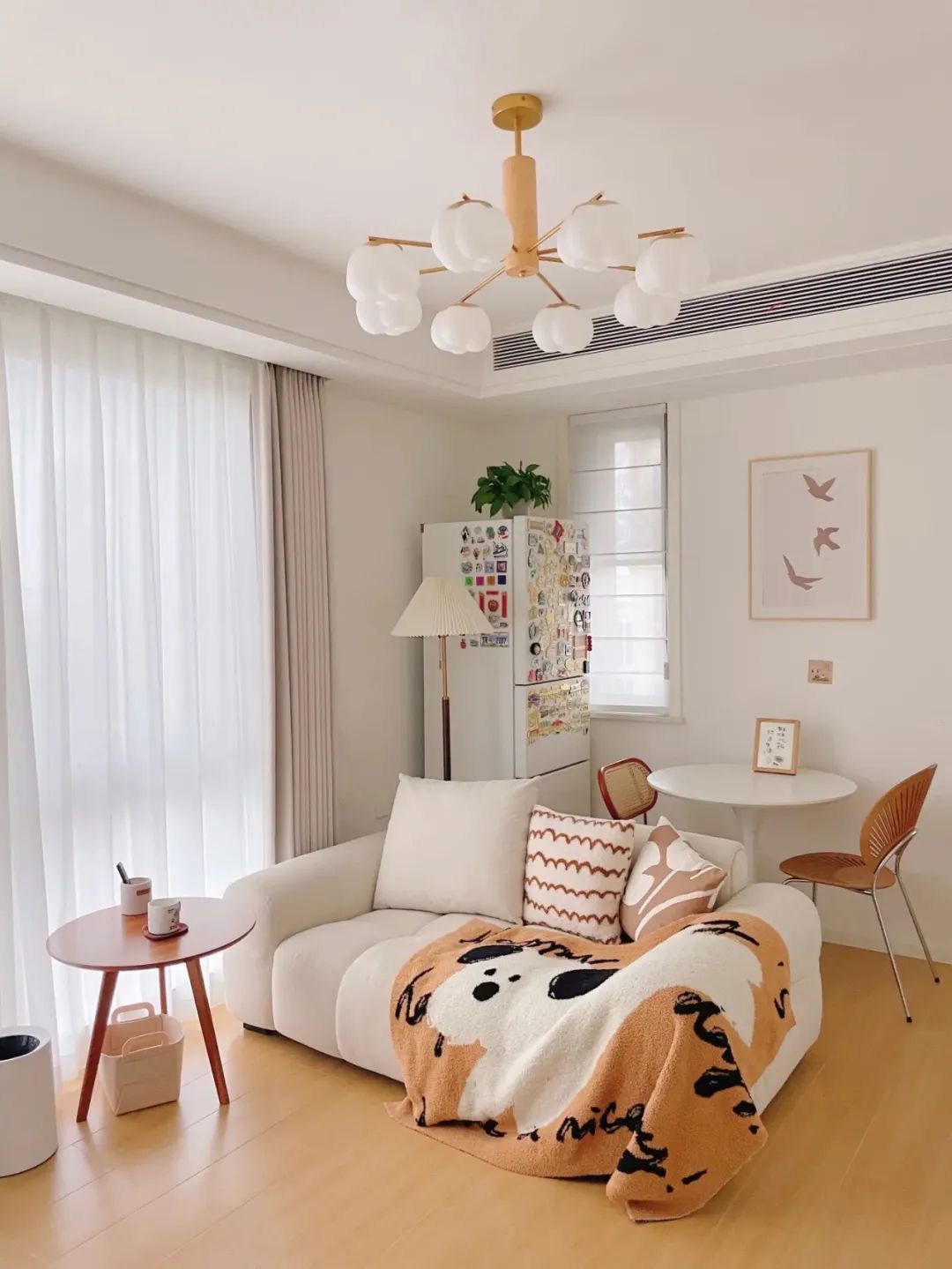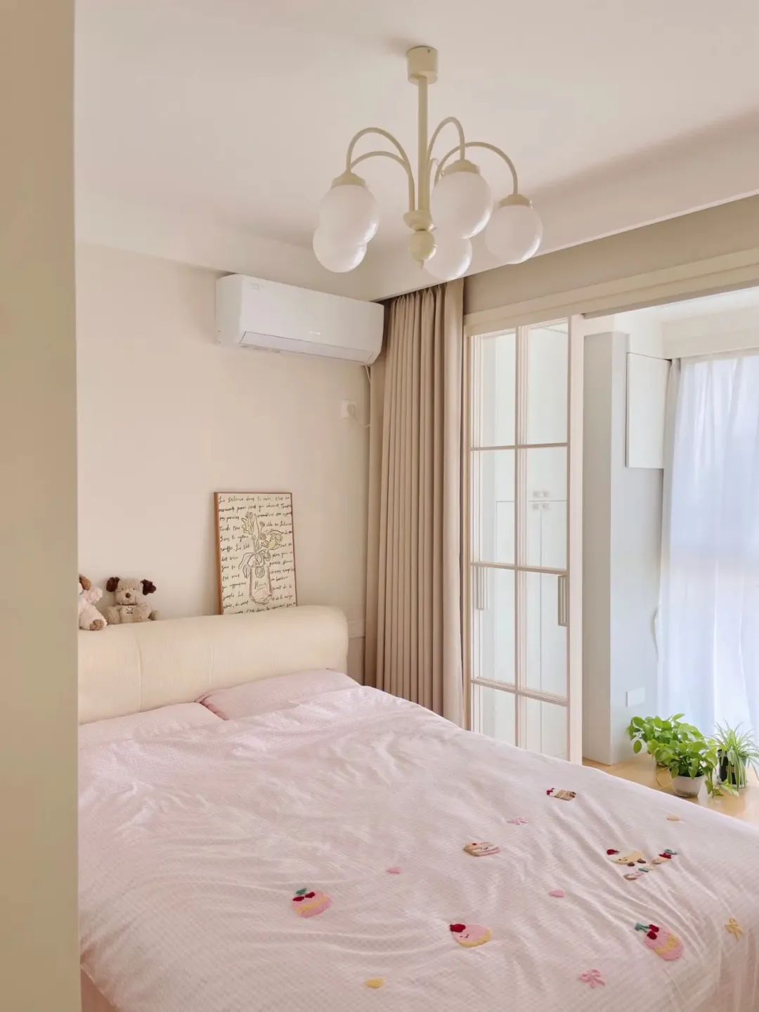 主卧和阳台打通,搭配了奶茶色的窗帘。