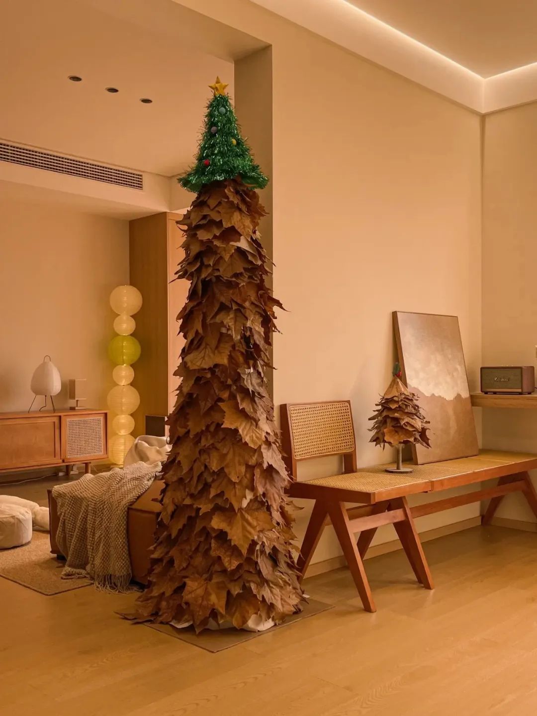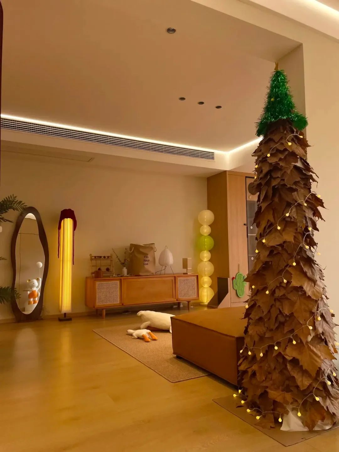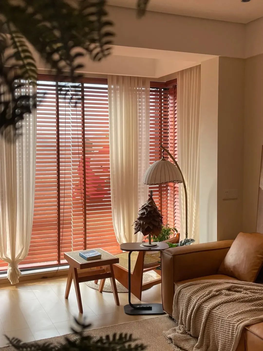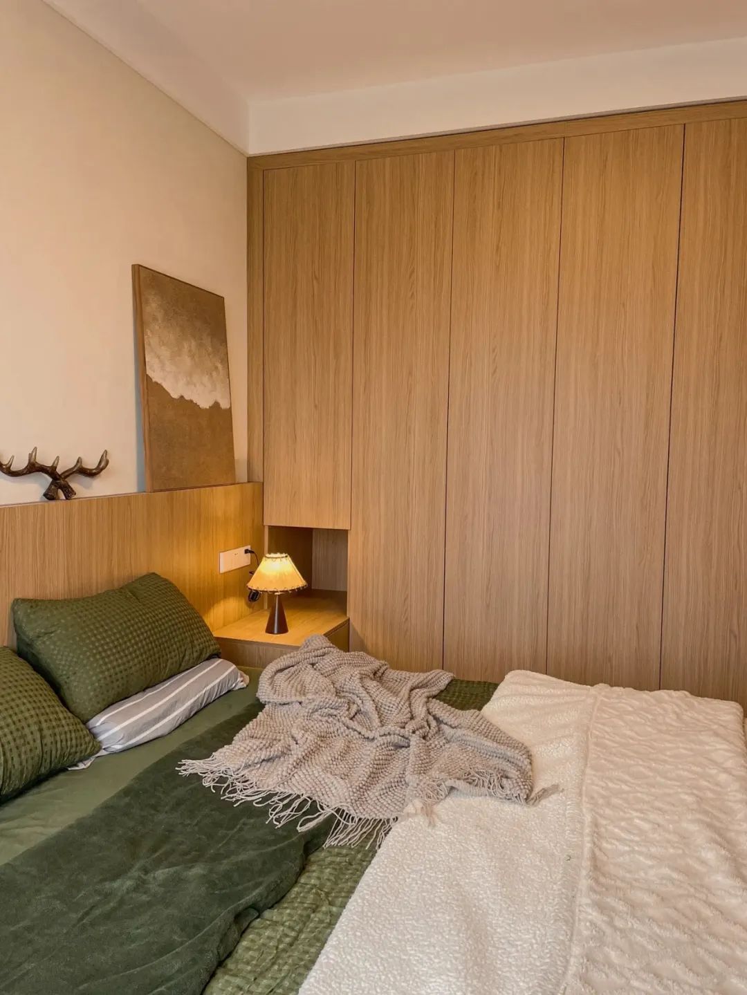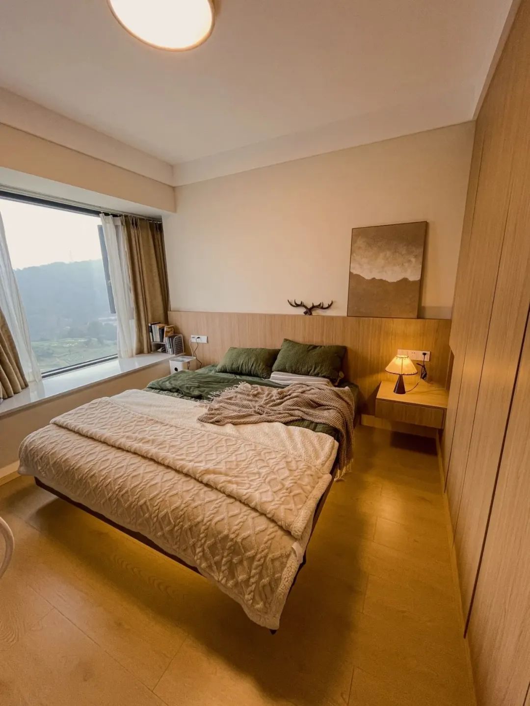 客厅开间3.4米,全屋通铺木地板,奶咖色乳胶漆上墙,简单整洁,也显大;