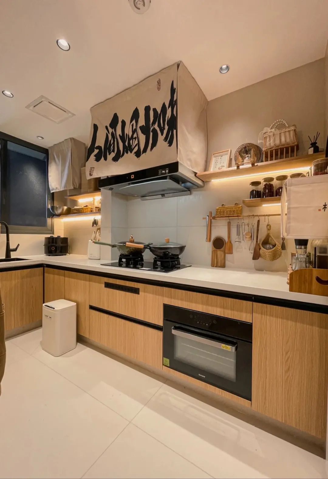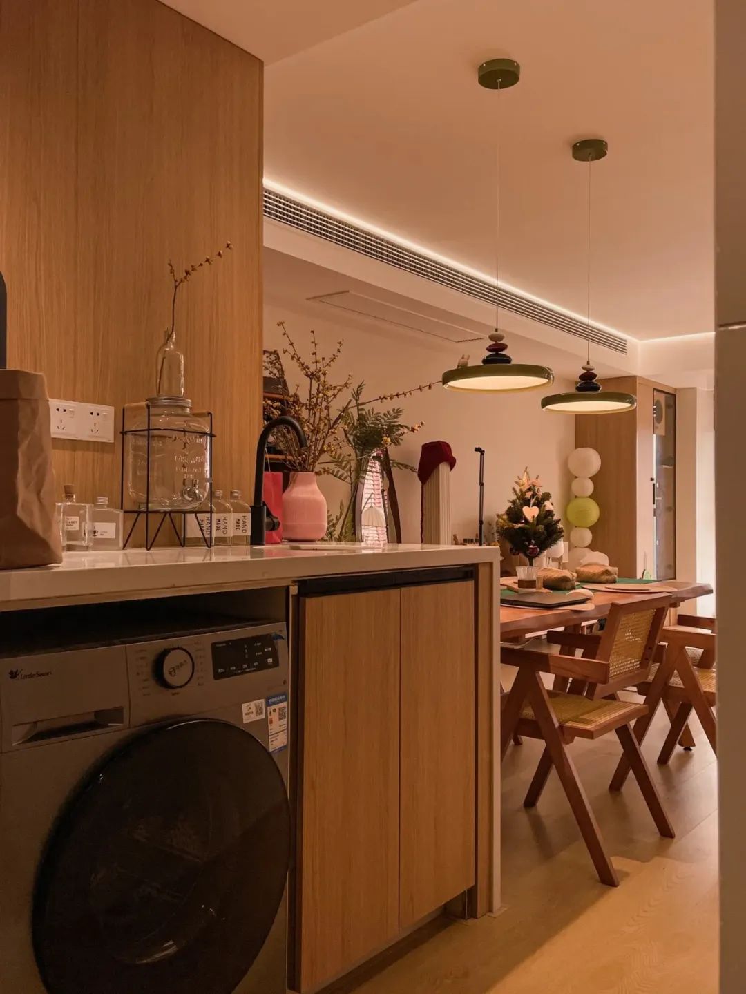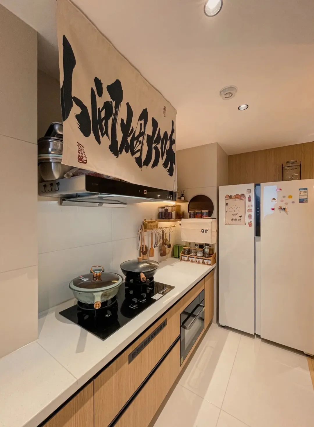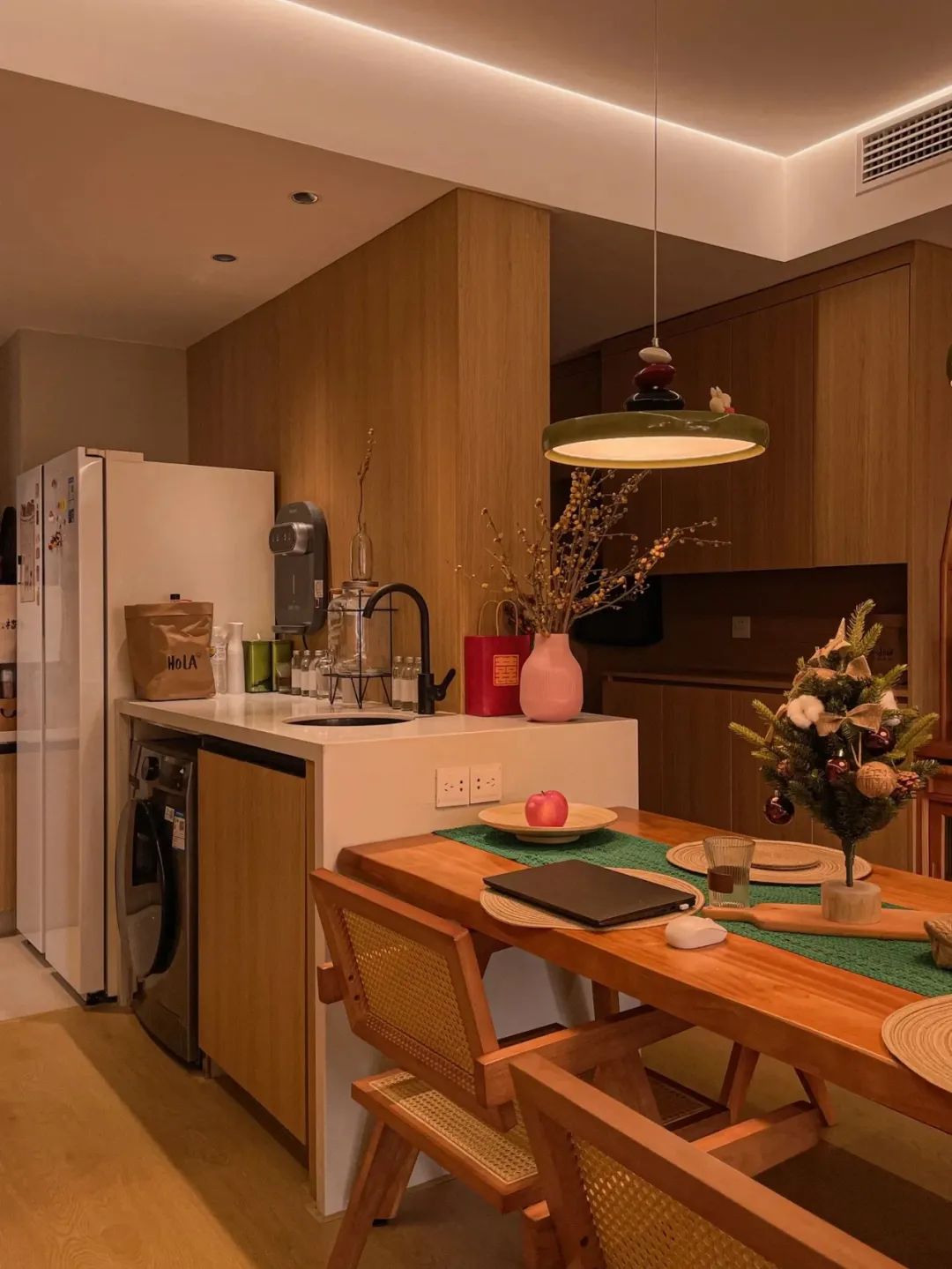把厨房门拆掉,做了开放式厨房,连通厨房做了一个岛台,成功把厨房、餐厅、客厅、书房、动线连通。