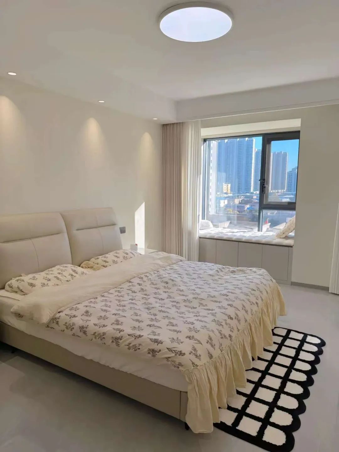 卧室采用奶茶色的主卧窗帘,搭配黑白配色地毯。