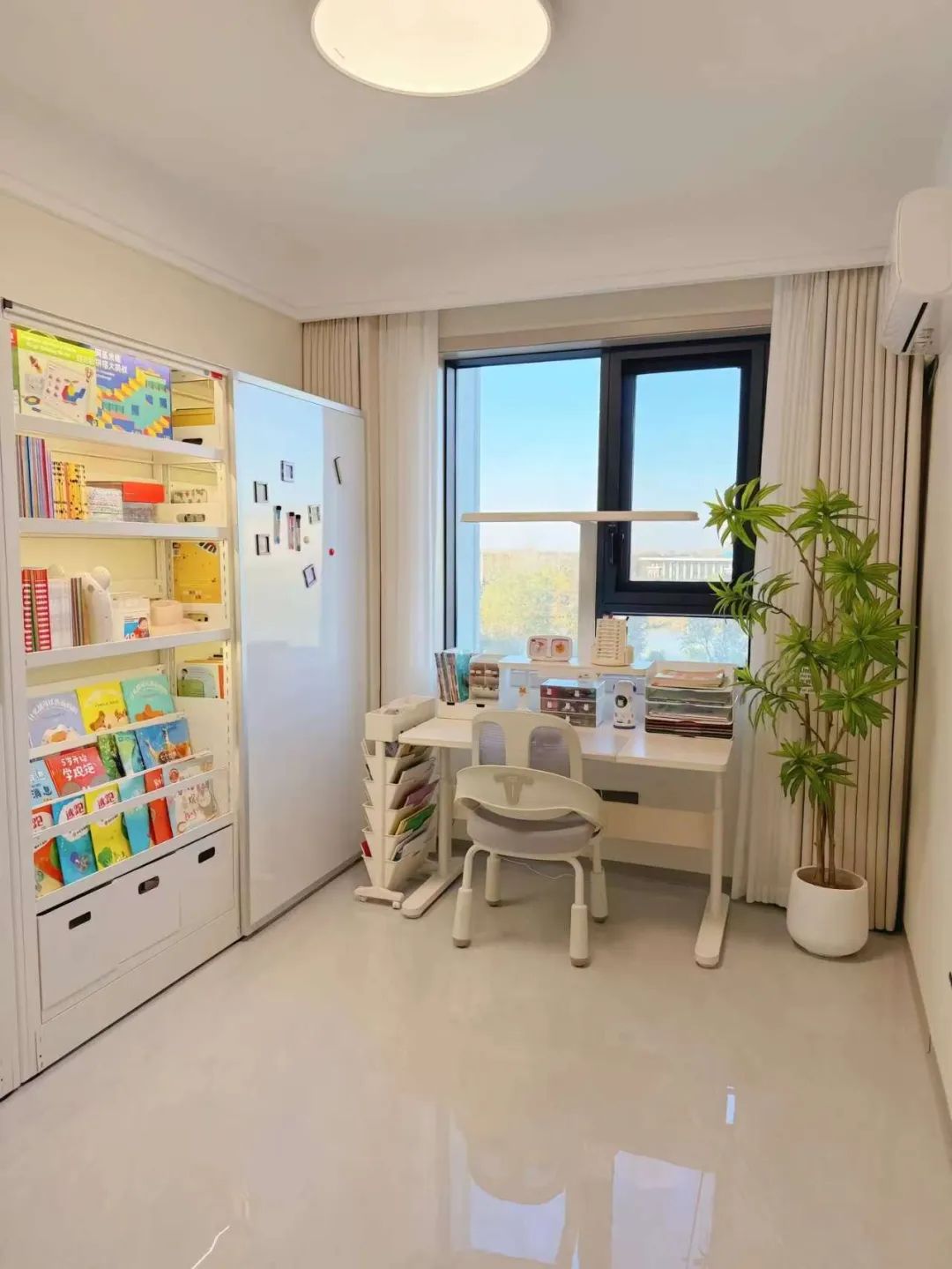 儿童书房放置书架和自动升降学习桌,搭配百合竹绿植。