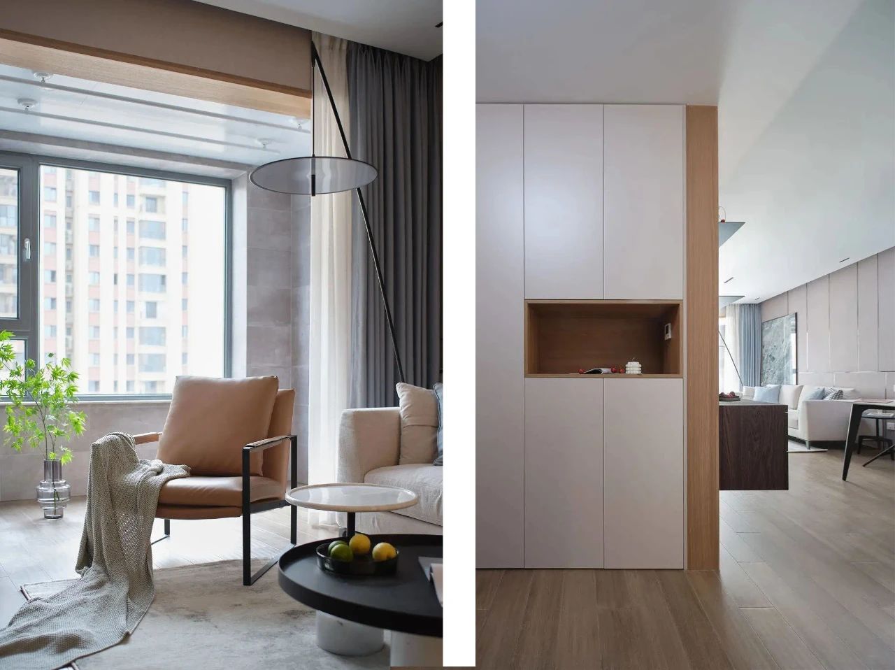 客厅与阳台打通,增加室内使用面积,改善采光,让室内的动线更加的流畅。沙发墙选用了大面积灰色调,内敛含蓄,不对称线条分割,将空间的严肃拘谨之感打破。
