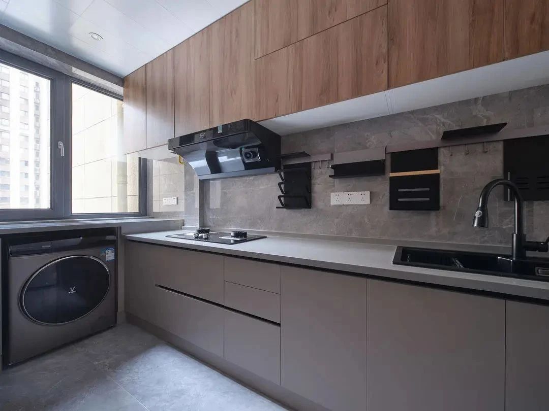 厨房与生活阳台打通,纳入厨房使用。也让通风采光更直接。洗衣机嵌入橱柜,节约空间,既美观实用也不影响厨房清洁动线。