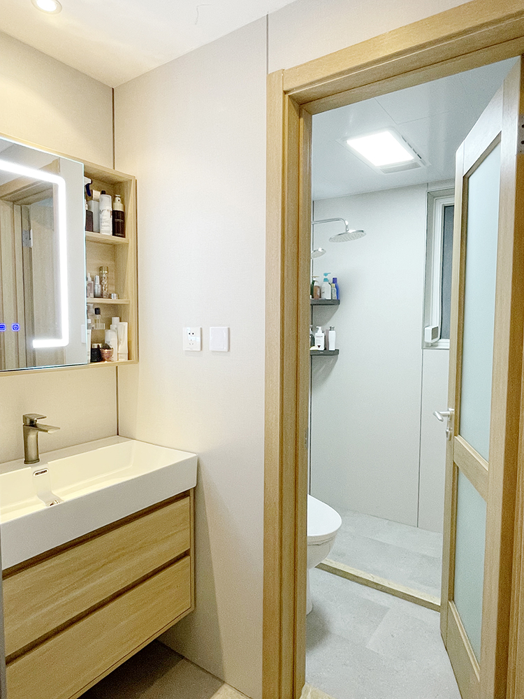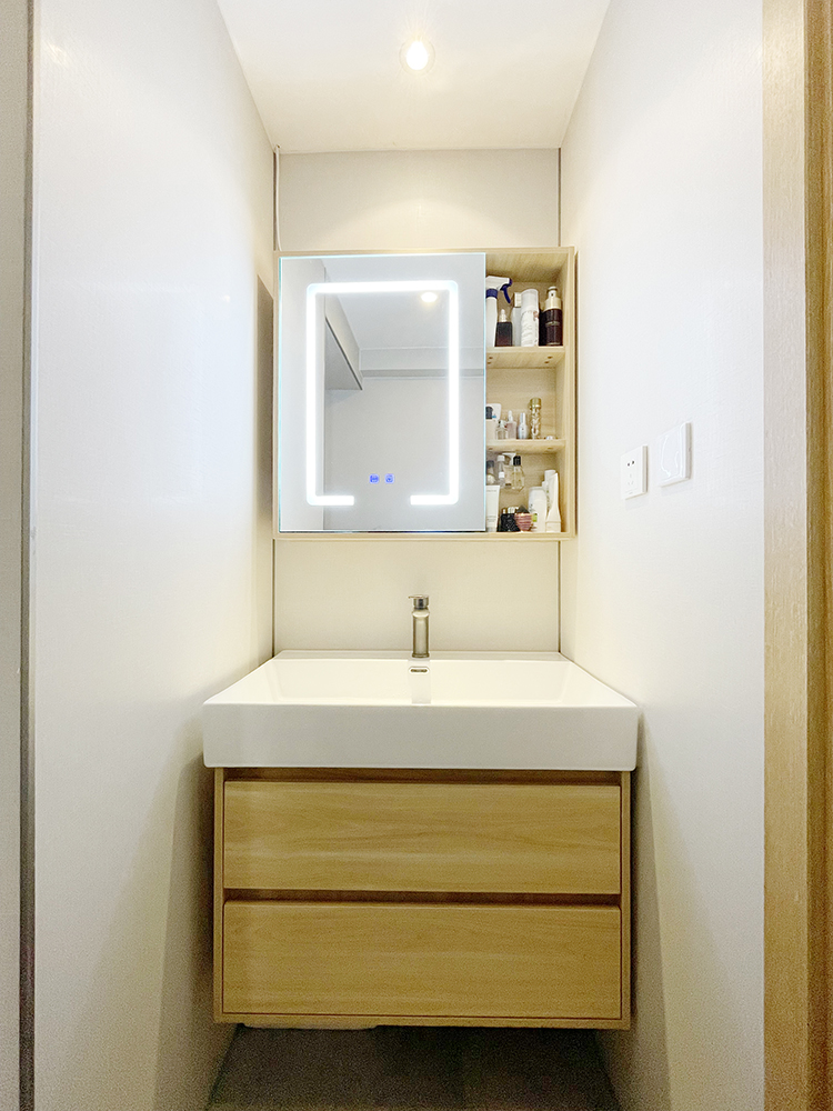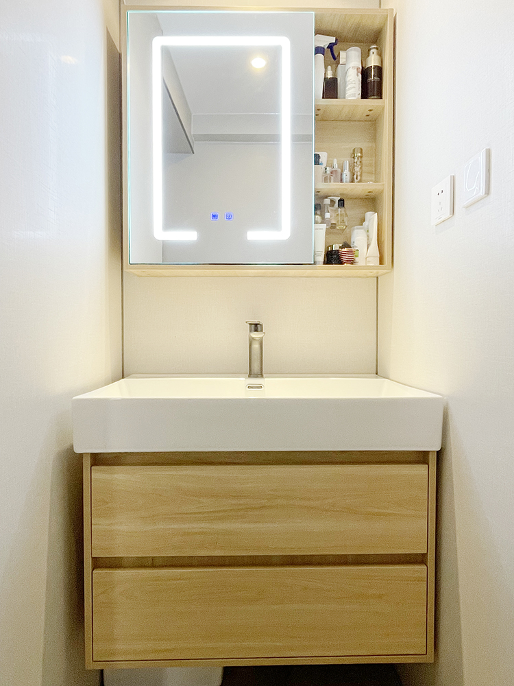 浴室柜选了一块超级温柔的原木镜柜,一柜两用,满足了对颜值和收纳的双重需求,幸福感up~up~