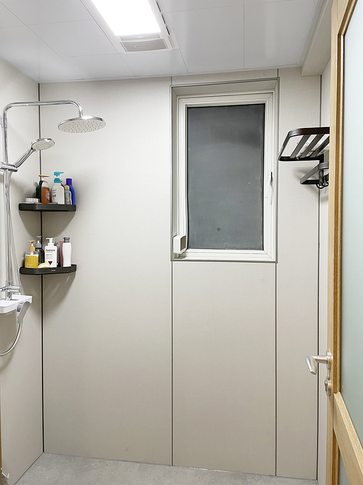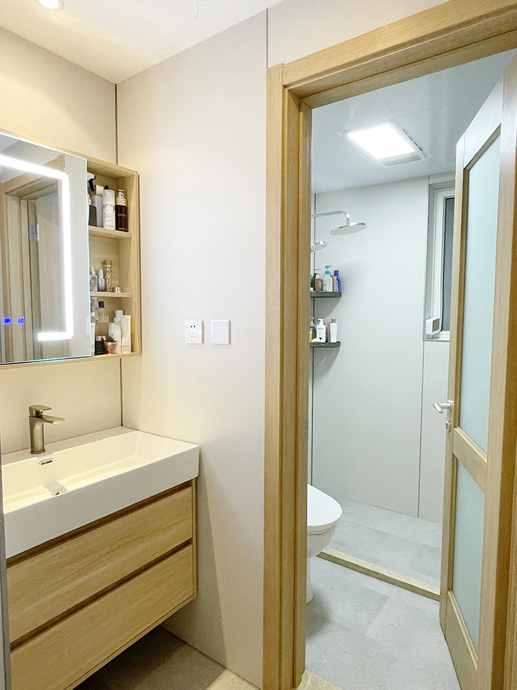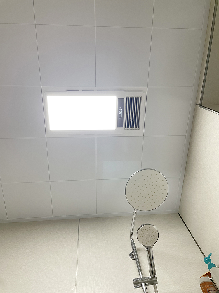 顶面换成了铝扣板集成吊顶,拆改方便还好打理卫生,四合一风暖浴霸,照明、取暖、换气、吹风统统安排上~