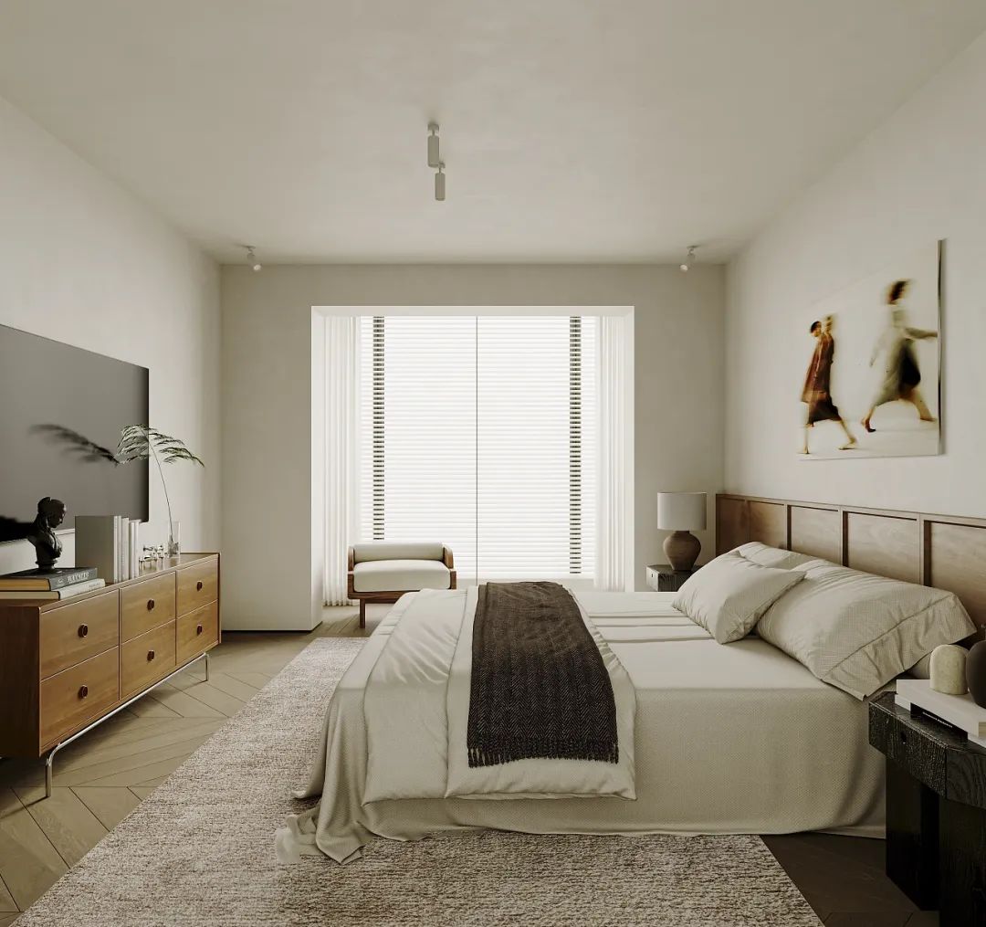 奶白色床头墙+净白的墙面天花,挂上灰色窗帘,在木地板的空间之下,为主人打造了一个简约自然而舒适的卧室环境。