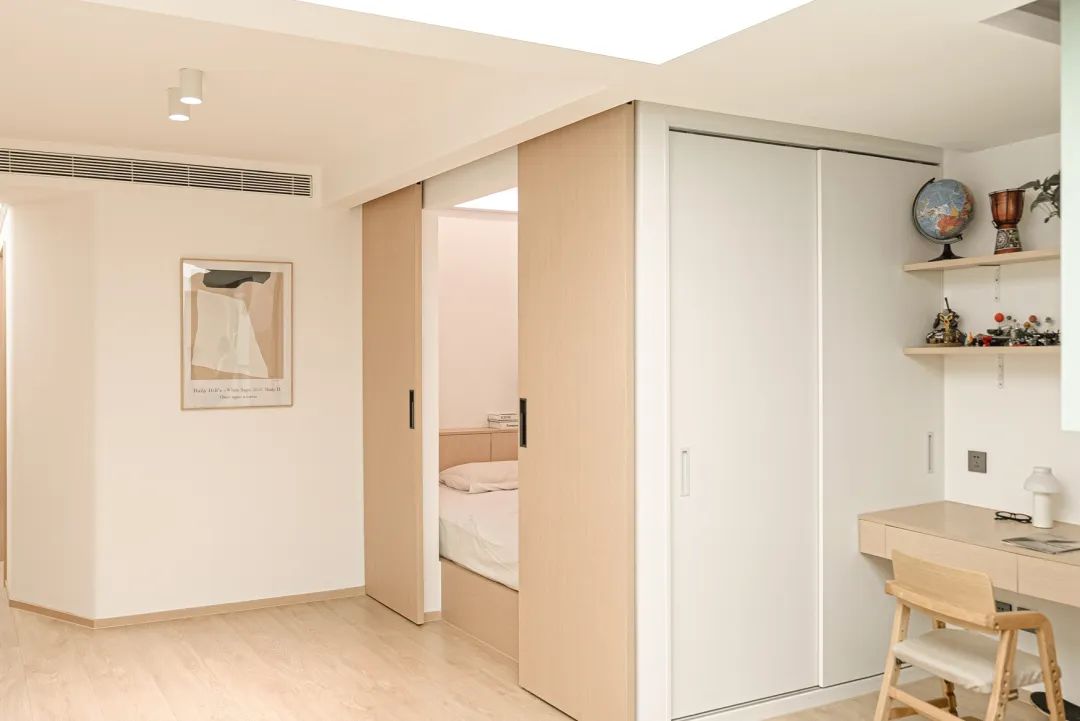 ▲设计师摒弃了传统的客厅布局,将空间打破重组,压缩主卧空间,实现了整墙收纳柜+老人房+儿童房+活动区的多功能设计,大大提高了空间利用率。老人房内部采用了榻榻米+床头柜一体化设计,满足居住+收纳需求的同时,节省了空间。