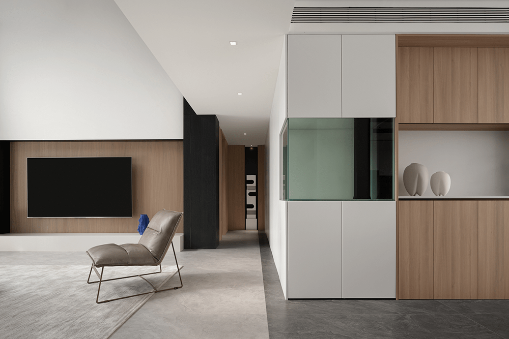 设计师重新解构空间,组成点线面的体块化设计,糅合并统一了空间调性。从上至下,从左至右,能看到黑白两色游弋在空间中,原木色的加入将细节一览无余的拉开,较好地点缀了空间中的节奏面,营造整体的意趣和舒适。