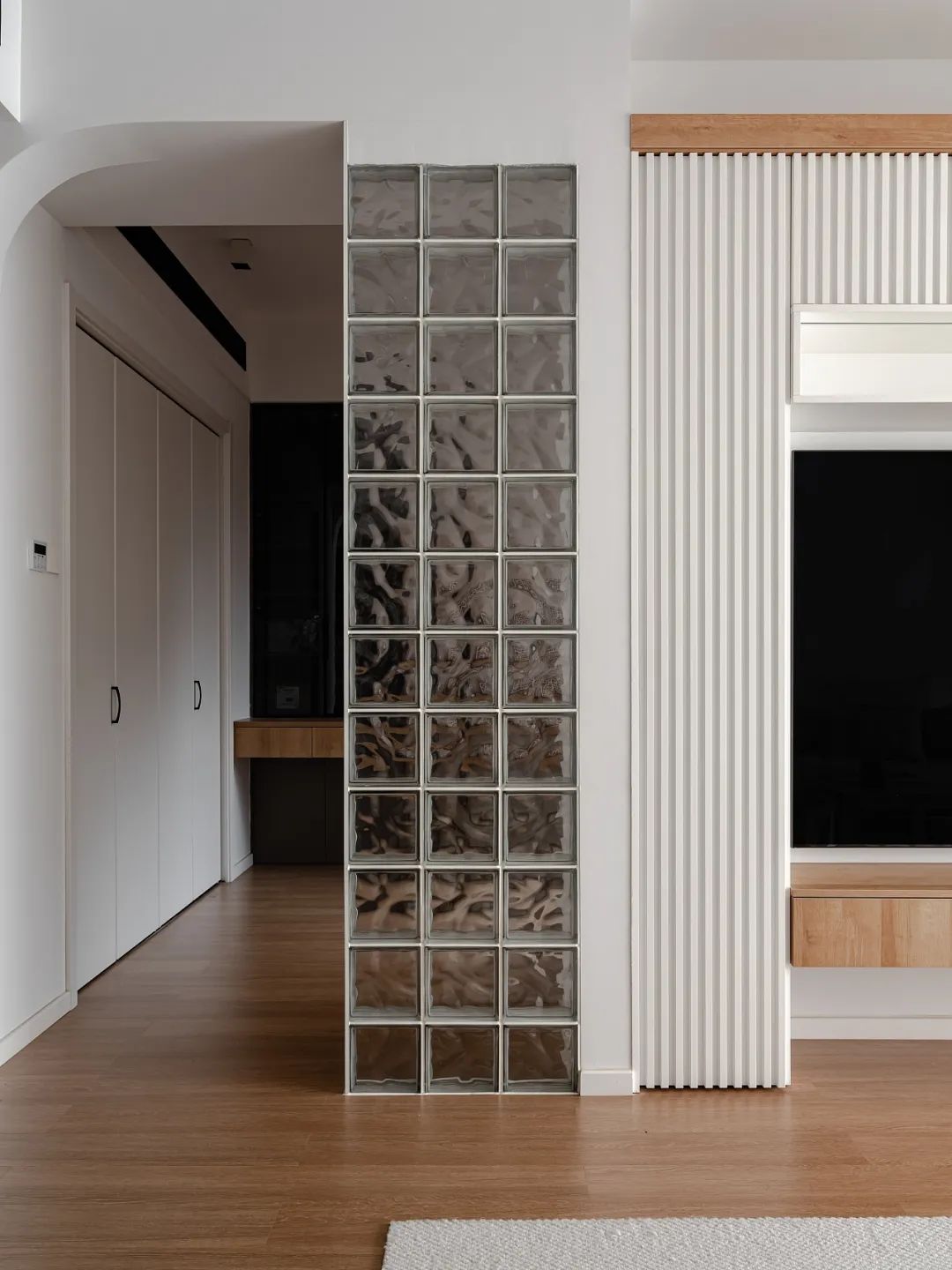 从客厅看向办公区,悬浮书桌把独立的承重柱与靠墙的柱子连接,并修饰美化。电视背景墙旁的玻璃砖隔断,作为分割线,划分出客厅和书房区域,既不突兀又能形成双向的互动性。