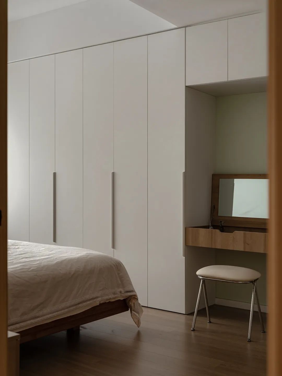 进入到卧室空间中,主卧延续温馨舒适的基调,将衣柜安排在床尾的区域,空间通透感倍增,室内多处运用木质元素进行呼应,从细枝末节诠释品质生活哲学,从中找到契合时代的符号,让生活更加井然有序。