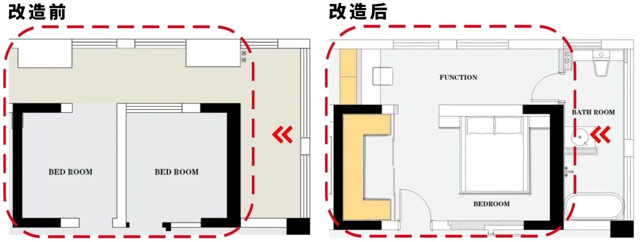 新砌一面墙,将L型阳台一分为二,面向入户门的变成玄关,另一部分纳入主卧。一面顶天立地玄关柜,方便收纳鞋子、雨伞等物件,保持空间整洁干净。