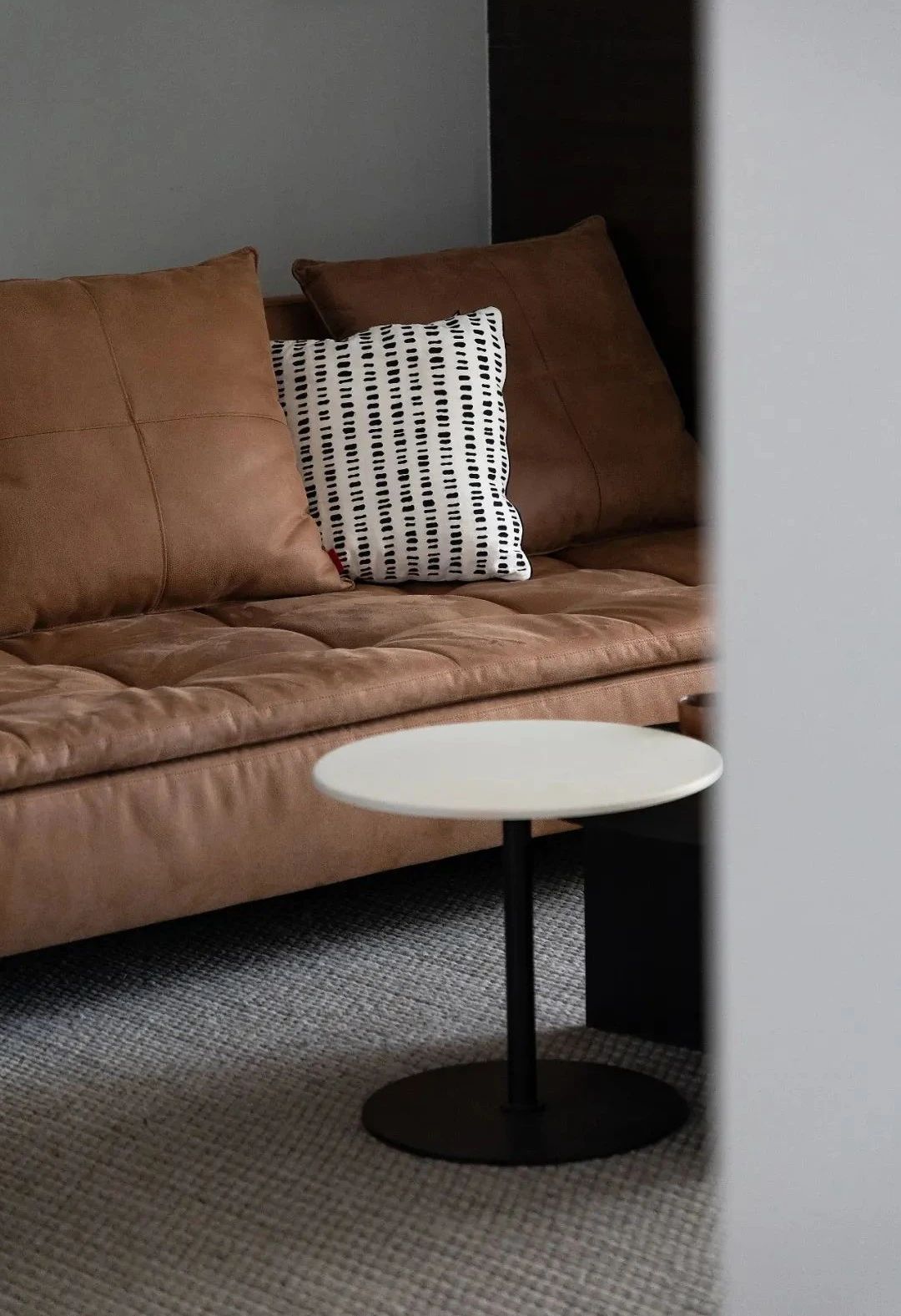客厅选用低饱和度配色,橡木吊顶搭配黑胡桃木柜体,清爽利落又不失家的温馨。客厅选用65英寸智能电视,同时还安装了投影仪,兼顾更多人的选择。沙发选择了做旧牛皮功能沙发,搭配黑白组合茶几,高级又舒适。