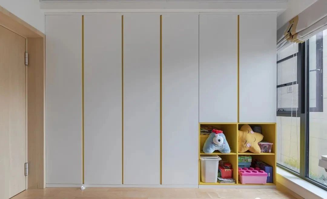 儿童房,定制了一排接近9㎡的大衣柜,通过白色与黄色的点缀,既带来一些童趣感,还能收纳很多东西。