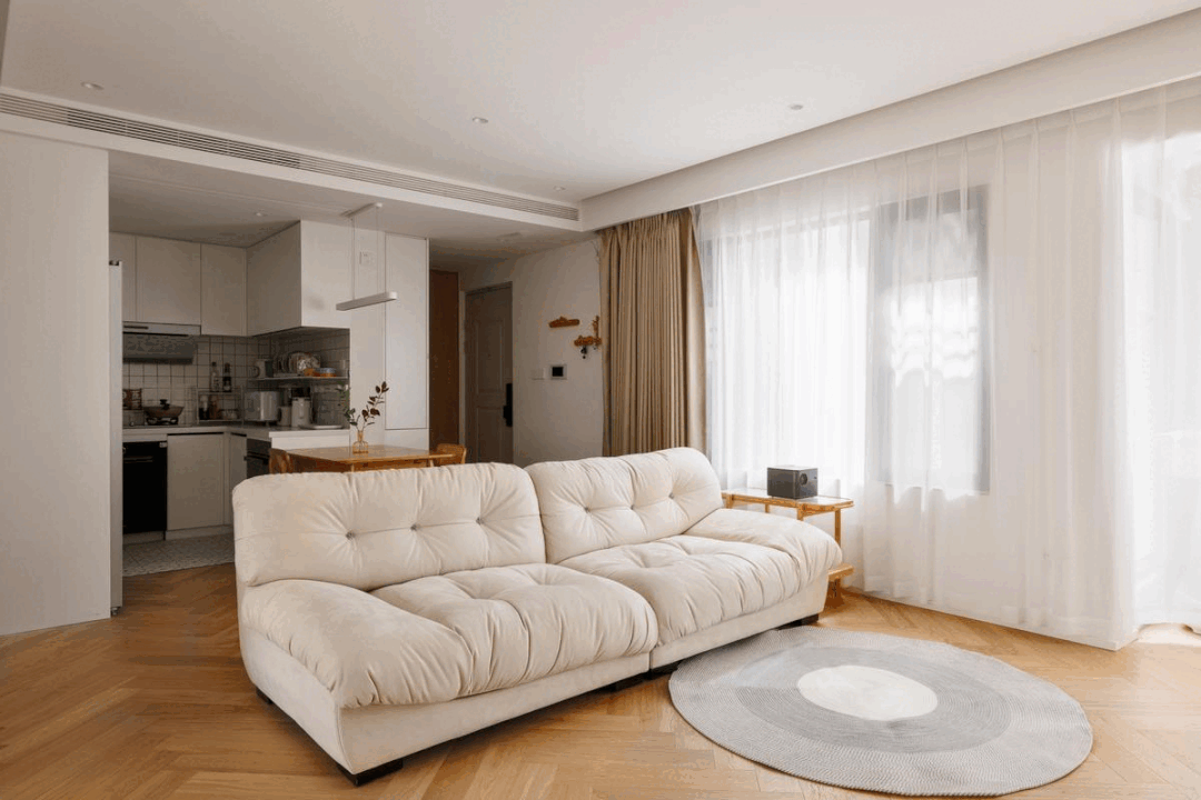 81㎡套内有完整的四个房间,虽然每个房间都不大,但都独立且规划相对合理。这样的布局极大满足人们在不同年龄段对未来10年甚至15年的居住需求。1、拆除客厅原瓷砖后,铺设木地板。为了更好的空间规划,针对空间进行了局部做了调整;2、厨房拆除原墙体后,增加了一组玄关鞋柜,餐厨一体设计,将空间打开;3、书房安排在正对客厅的房间,将门洞进一步扩大,改为折叠推拉门。