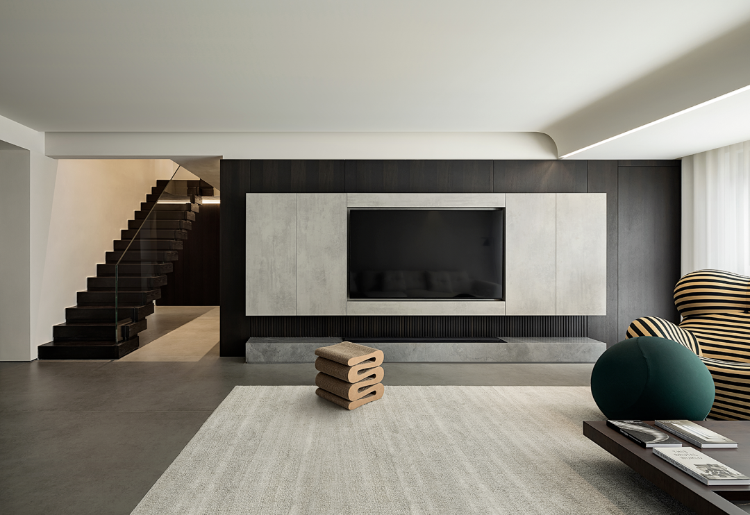 开放的客厅区域最为引人晒目。作为家庭成员的共享生活空间,它必须展现出多元化与多功能化的一面。橡木饰面背景墙、艺术性极强的沙发椅、现代极简灯饰建立起干净利落的空间联系。