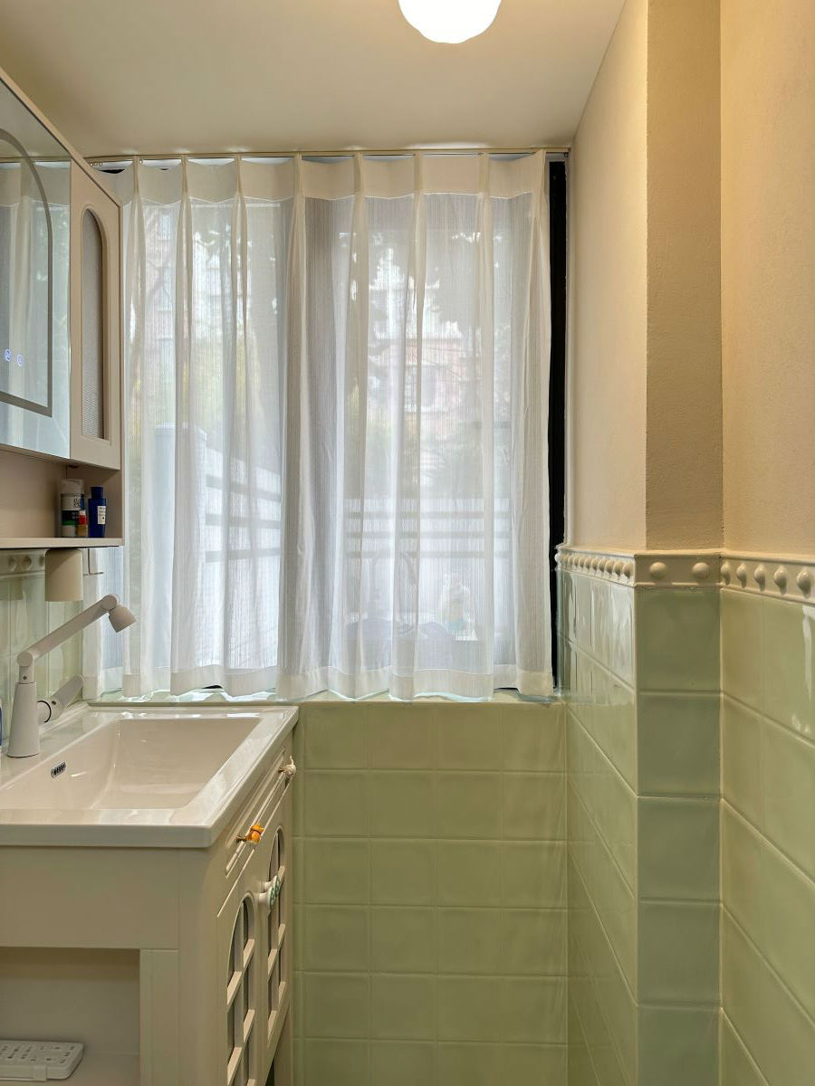 卫生间采用一体盆,台面易于清洁和维护,与墙面地砖搭配和谐,主体色调以白绿相配,清新脱俗。