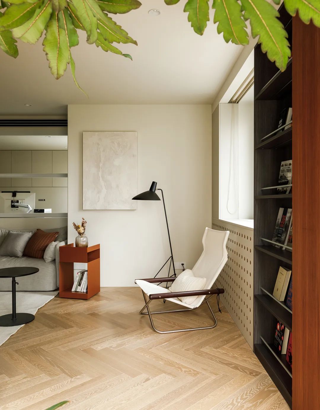 客厅因为半开放式书房的设计,采光和通透度大大提升,一改客厅进深窄的不足,进一步优化公共空间的居住体验。