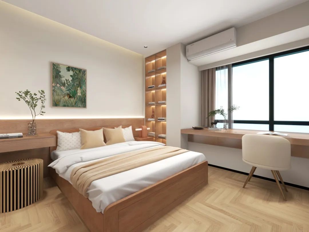 主卧突破传统布局,将飘窗延伸为悬浮书桌,内嵌式书架与侧墙通顶衣柜形成收纳矩阵,书籍、衣物各归其位