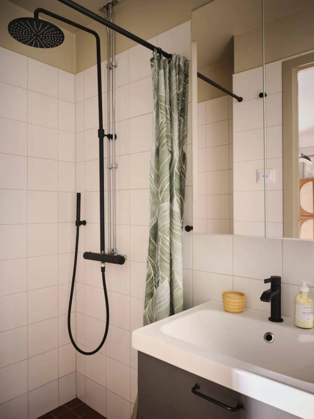 一个舒适的睡眠角落紧邻客厅,深绿色的遮光窗帘可以拉上,创造出一个私密且黑暗的睡眠角落。